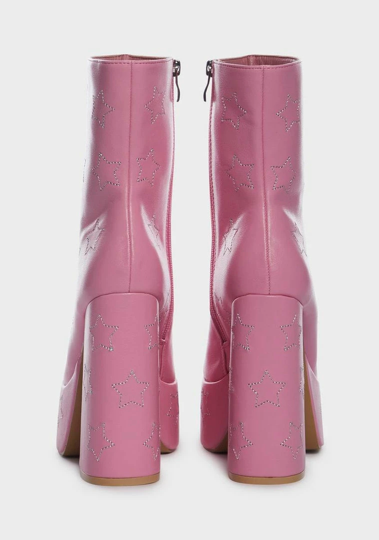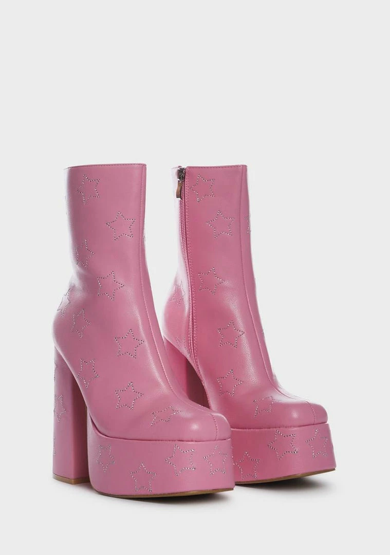 cuz life’s a fairytale! These platform ankle boots have a vegan leather construction, metallic embroidered stars all over, side zip closures, and block heels.