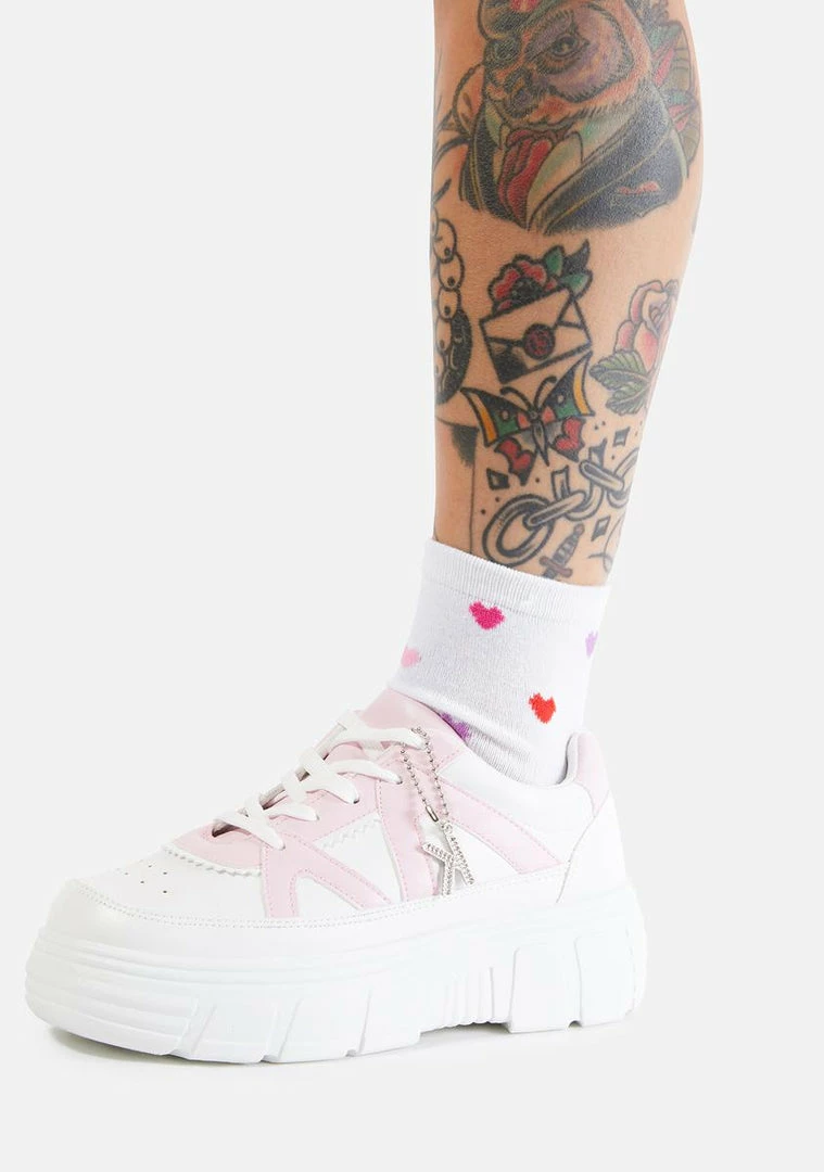 cuz ya got your eye on the prize. Go for the win in these chunky vegan leather sneakers that have thick treaded platform soles, lil K keychain charms and adjustable lace up closures.