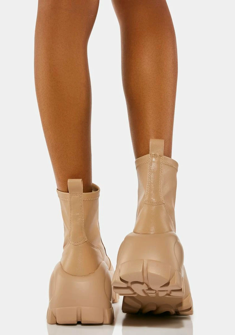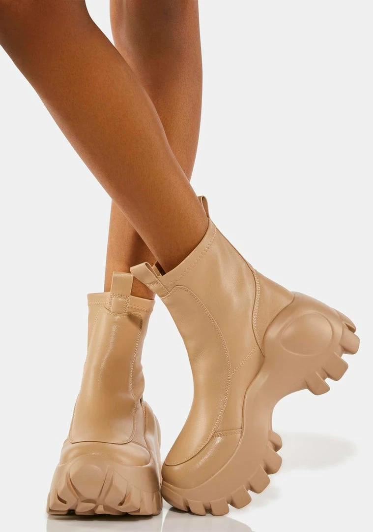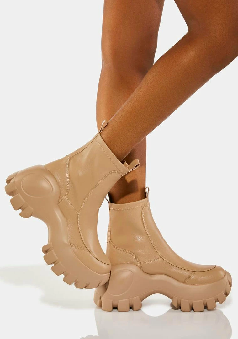 come in a vegan leather construction, with a ridged rubber sole, and an ankle length with pull tabs.