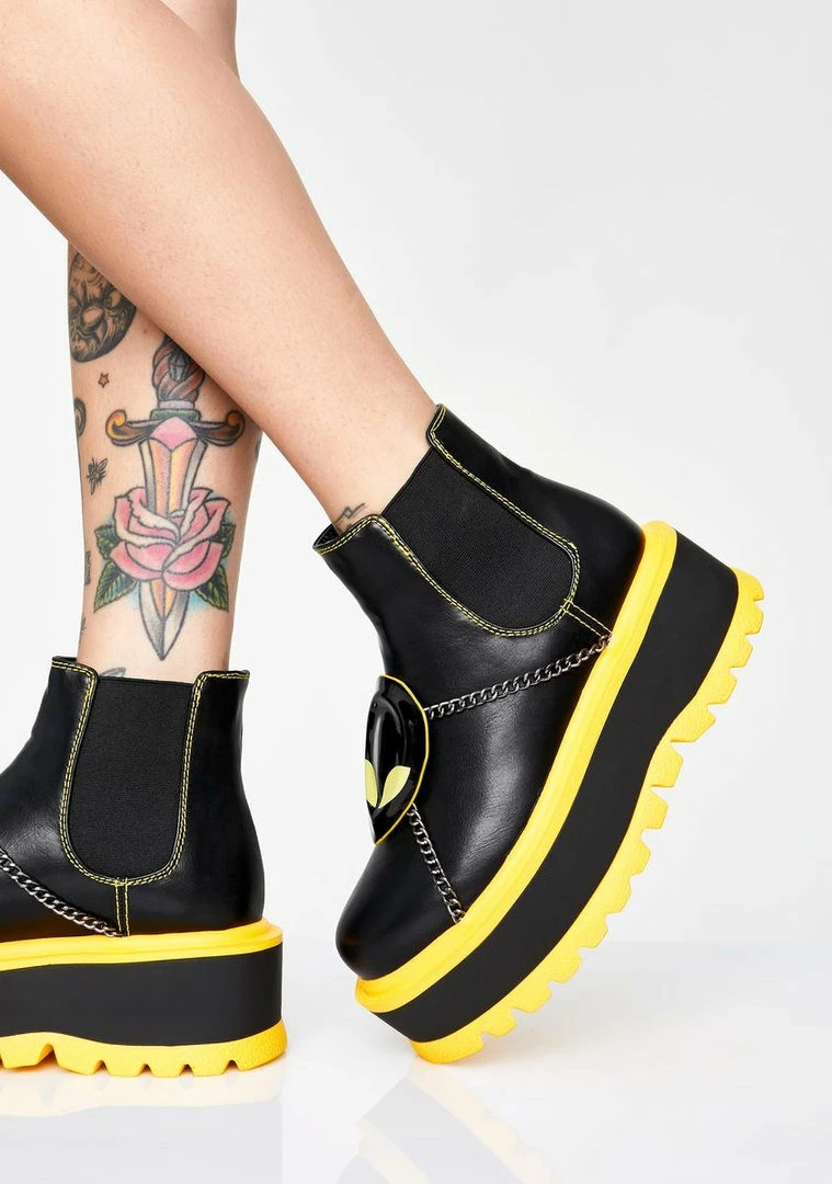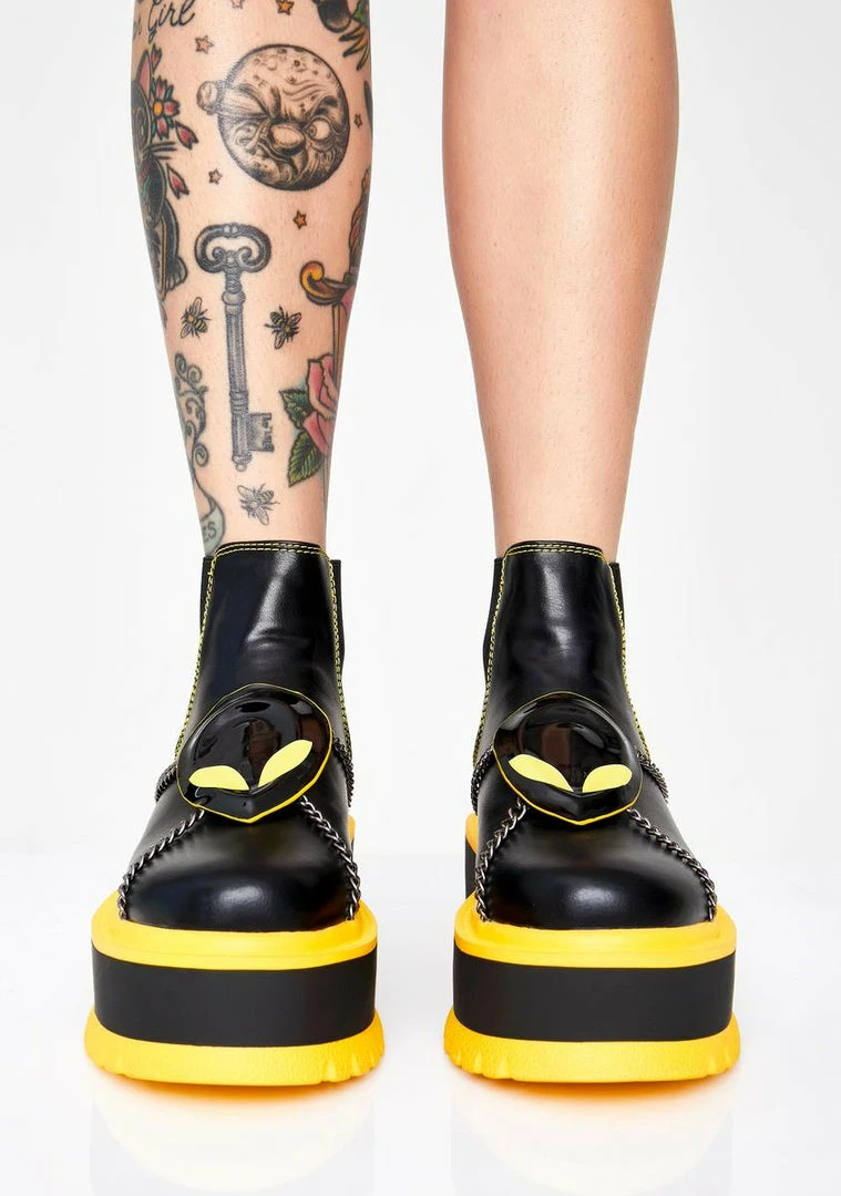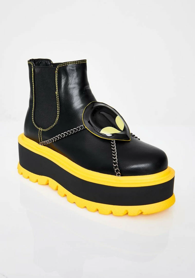 will have ya stealinΓ’ΒΒ ya alien in style. Storm the scene in these dope ankle boots that have xxtra chunky platforms, patent alien head, chain hardware NΓ’ΒΒ sikk sole detailing.