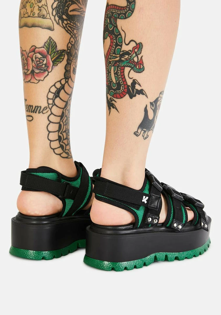 cuz youΓ’ΒΒre so over this planet. These outta this world sporty sandals have chunky platforms, contrast lug soles, back Velcro straps, and mesh uppers with buckle accents.