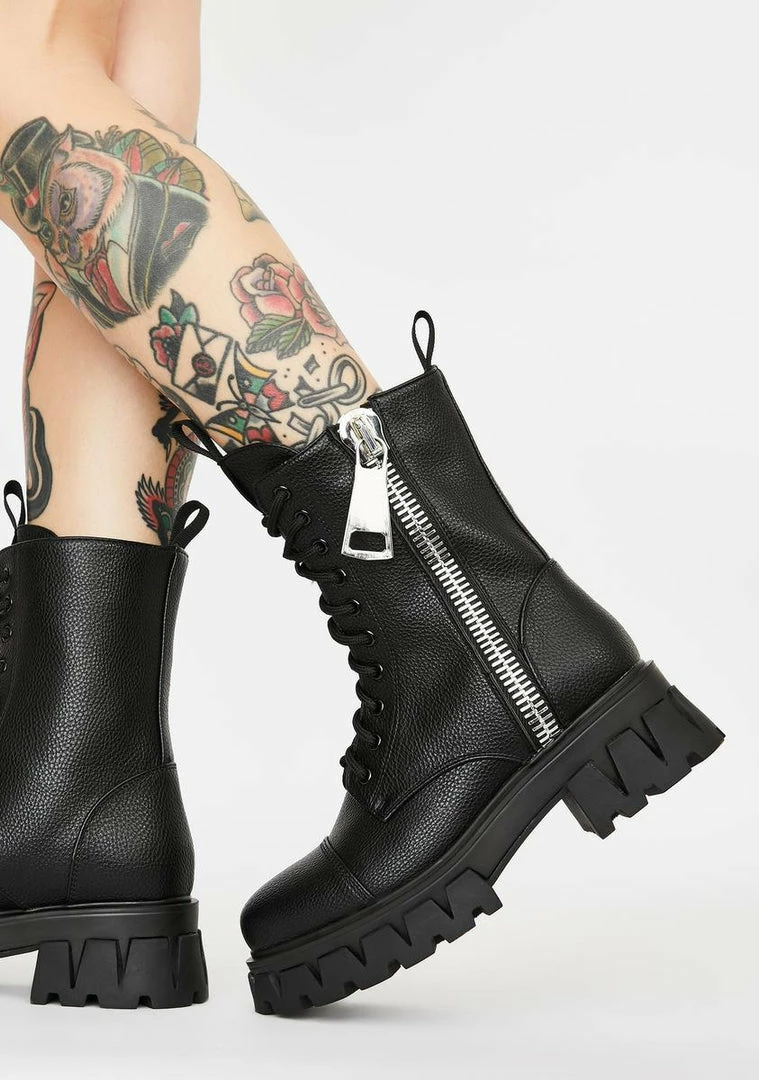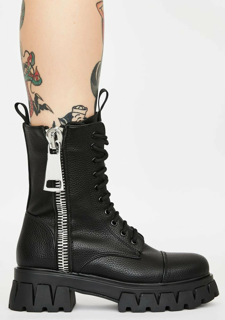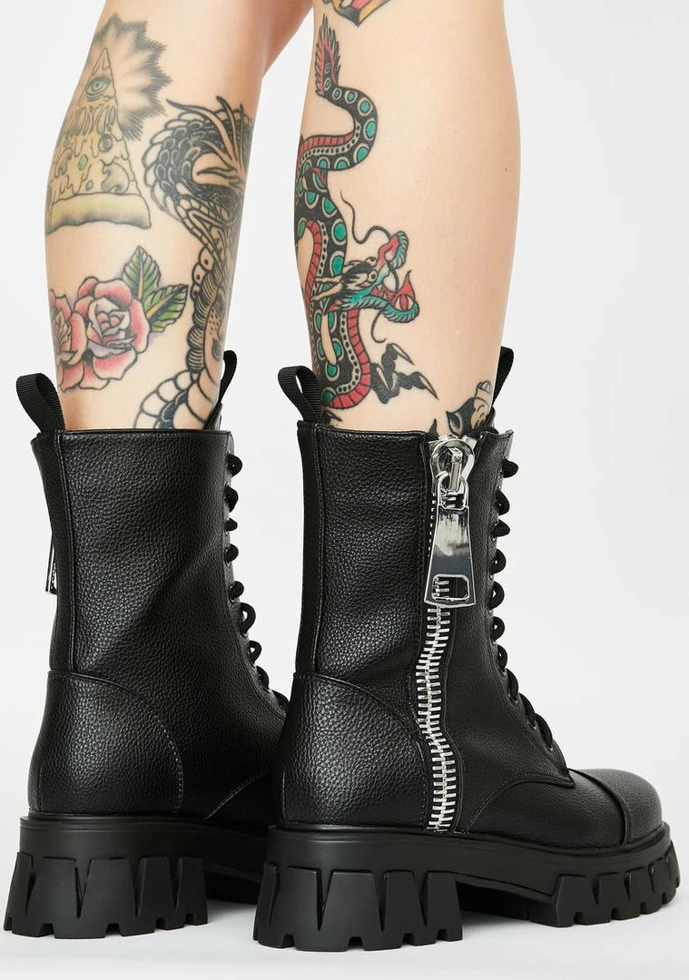 cuz youâre takinâ it to max overdrive! They canât handle ya in these vegan leather combat boots that have chunky platform soles, adjustable lace-ups, and exXxtra-large side zip closures.