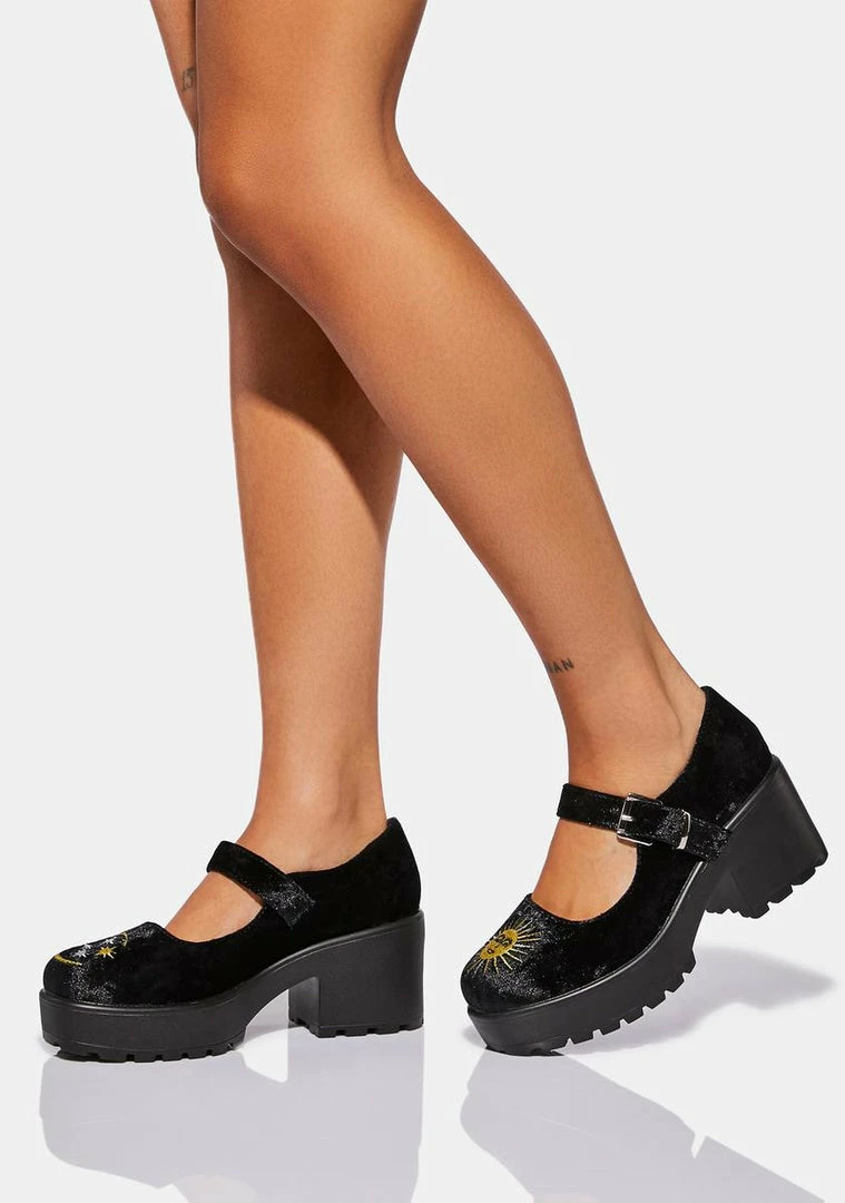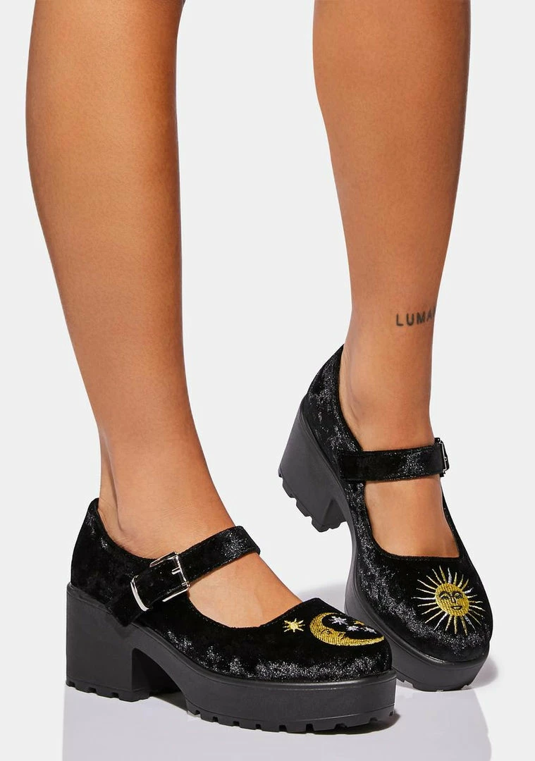 cuz you cast a spell on everyone babe! Be enchanting in these mary janes which have a crushed velvet construction, chunky heels, embroidered sun and moon graphics, and adjustable buckle strap closures.