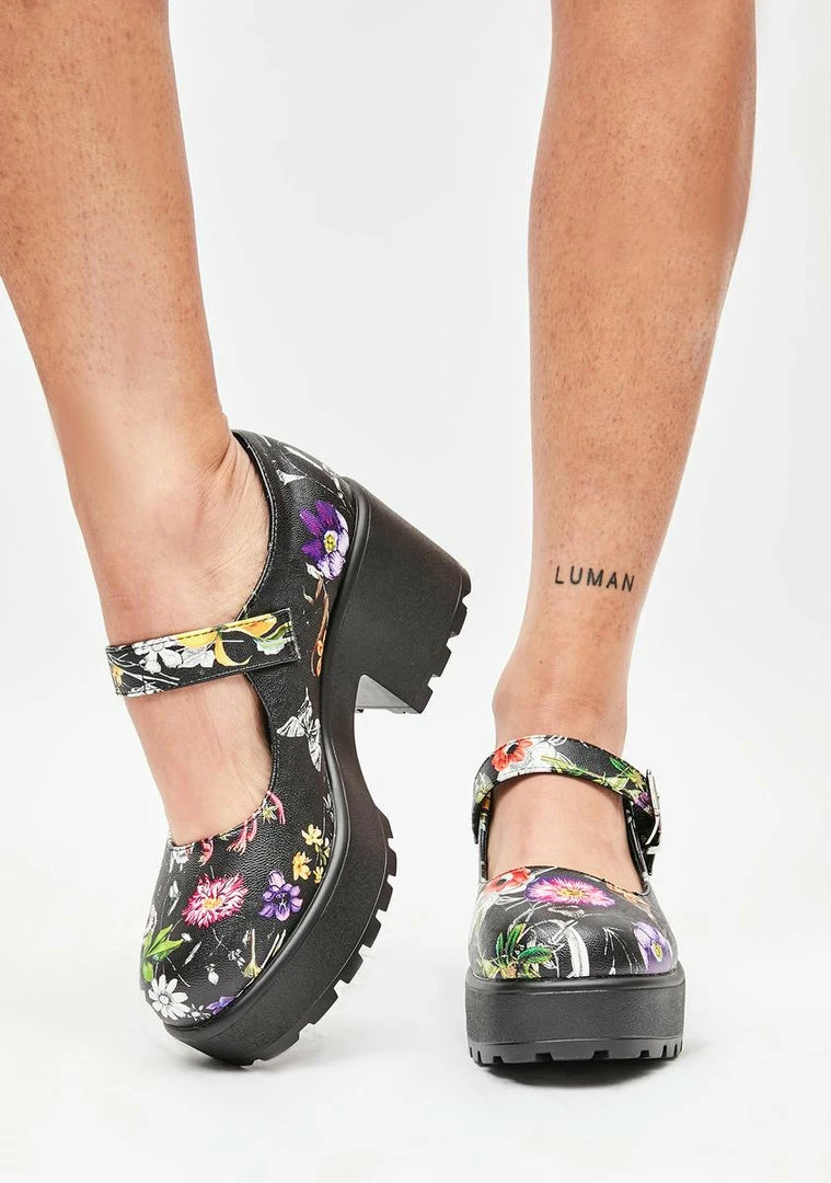 spring into action, babe! These floral print mary janes have a vegan leather construction, chunky block heels, and adjustable buckle strap closures.