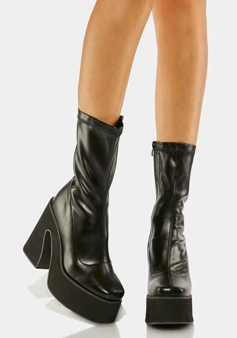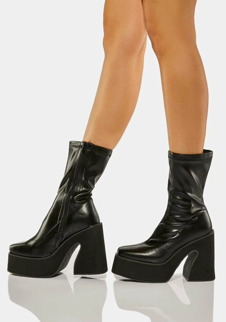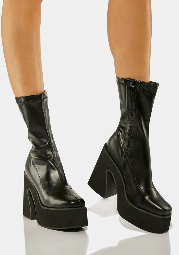 cuz you’re one of a kind. These boots come in a vegan leather sock fit, a chunky heeled platform, and side zipper closures.
