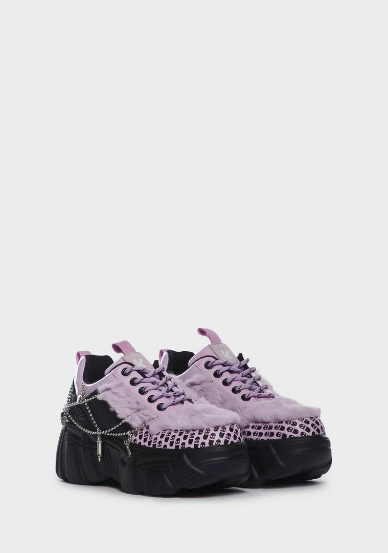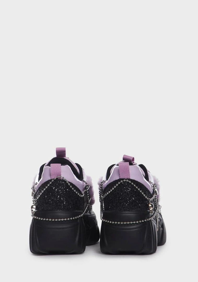 got you on the dad shoe trend! These platform sneakers have a two-tone vegan leather construction, adjustable lace-up ties, ball chain hardware with miscellaneous charms, faux fur trim, and a razorblade print at the toes.