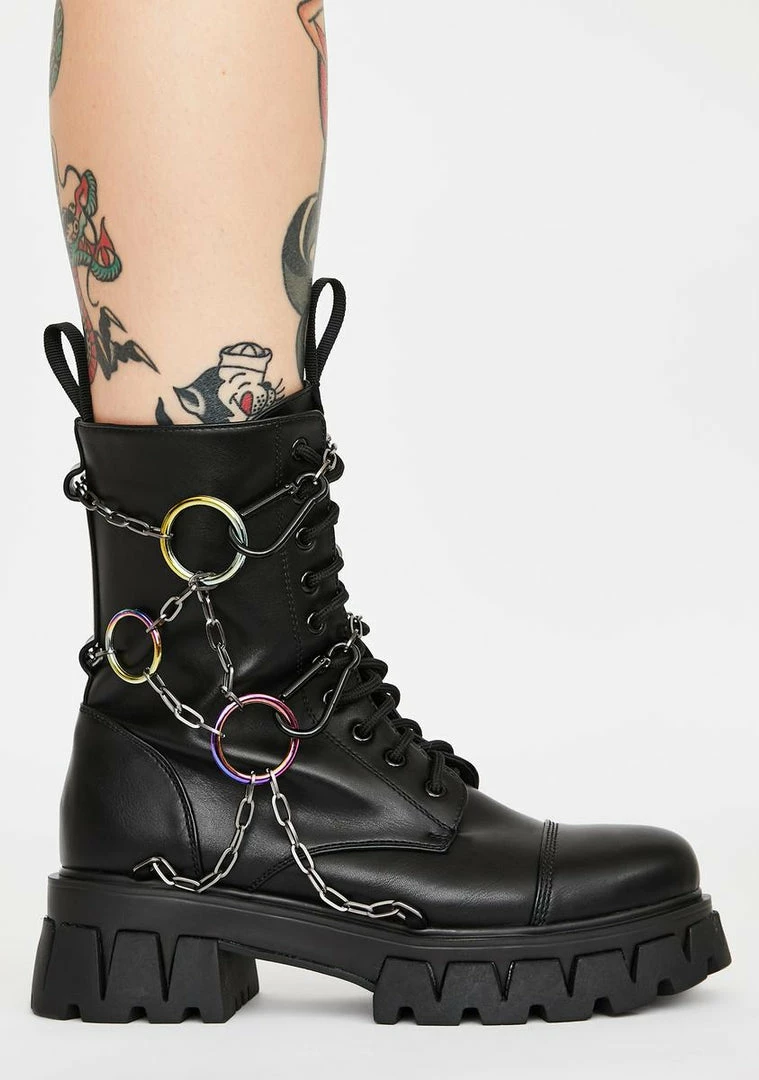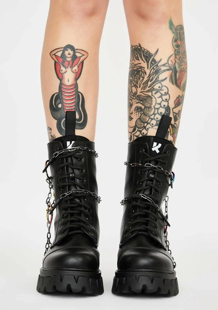 cuz what theyâve heard on the street is true, babe. Youâre a badazz bish in these combat boots that have a vegan leather construction, silver chain hardware, lace-up closures, and a treaded sole.