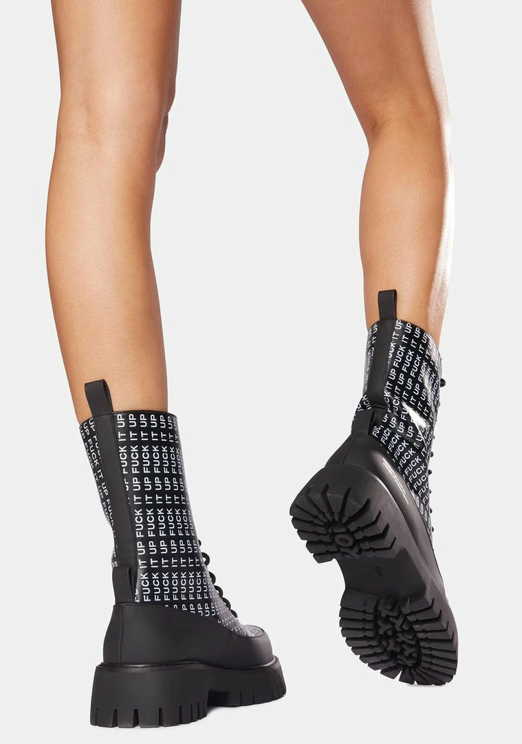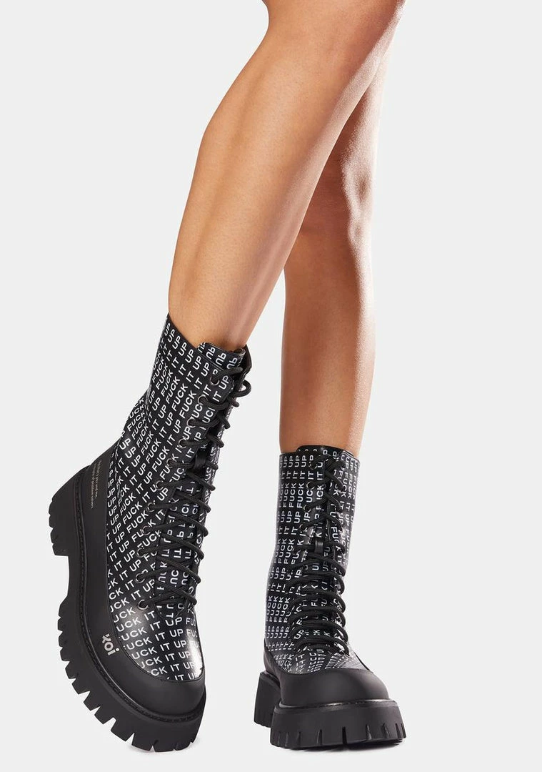 do it your way, babe! These sikk combat boots have chunky treaded soles, lace up fronts and vegan leather uppers with a รขยยFuck It Upรขยย print all over.