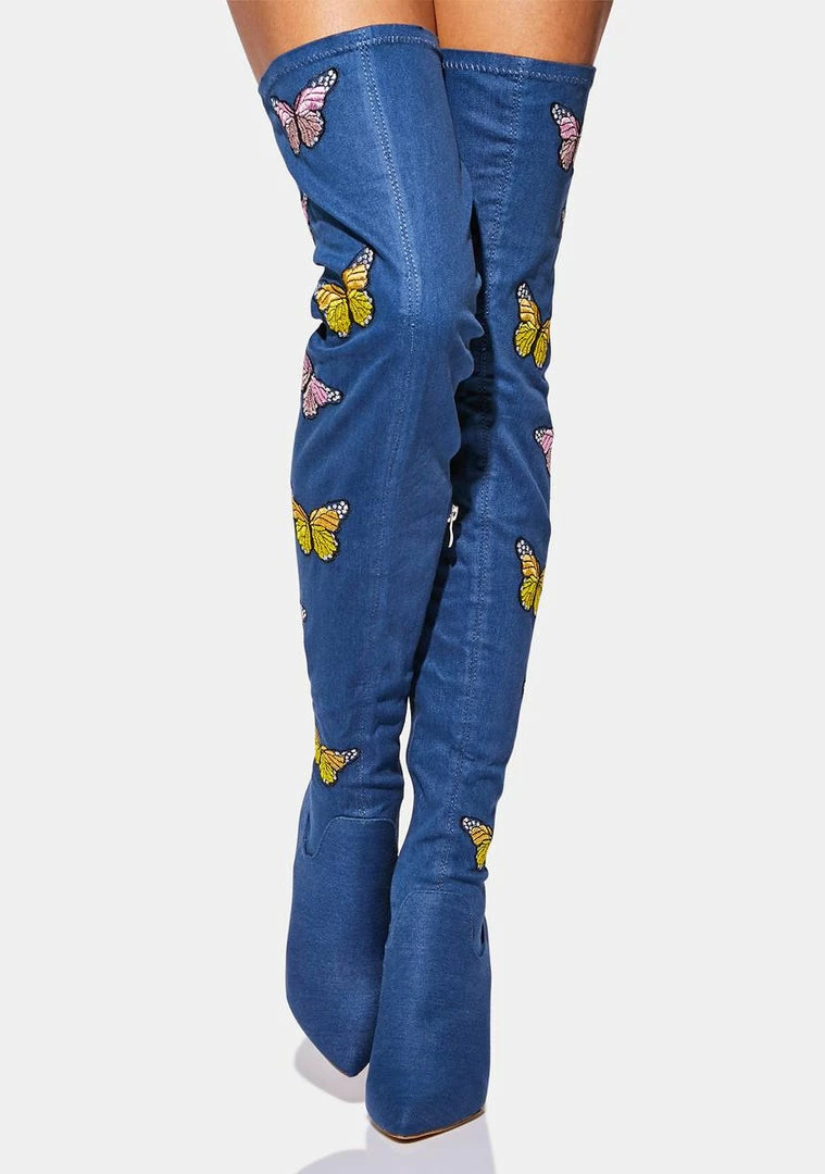 cuz you give them the flutters.These thigh high boots have a denim construction, pointed toes, block heels, embroidered butterflies all over, and side zip closures.