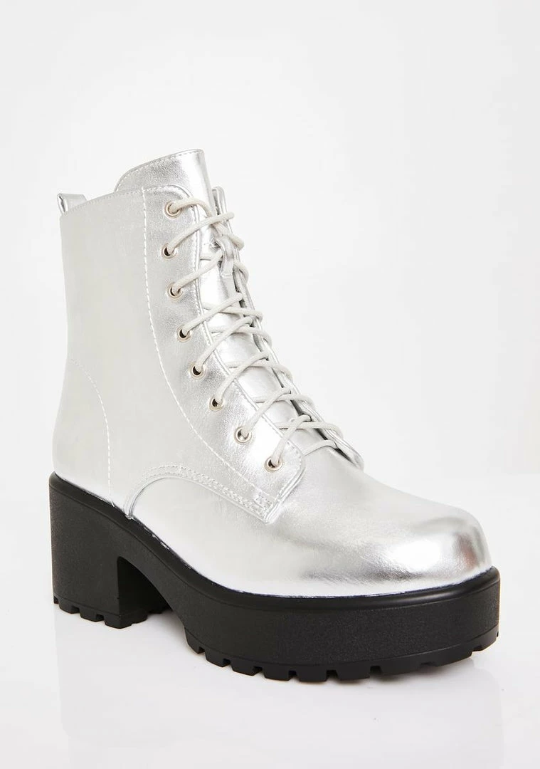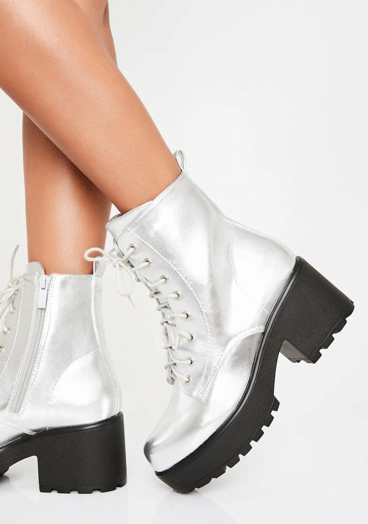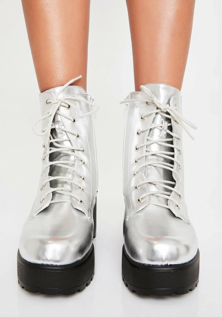 cuz youâre a space cowgirl, babe! Look like youâre from another galaxy in these sikk boots that have treaded soles, metallic uppers, and lace up Nâ zip closures!