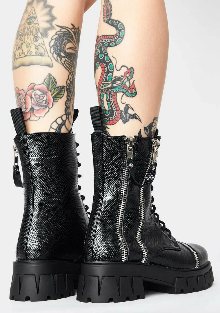 cuz youâre above the law! Stomp out the haterz in these sikk vegan leather combat boots that have a snakeskin embossed pattern, double zip closures, treaded soles, lace up fronts Nâ dual pull tabs.
