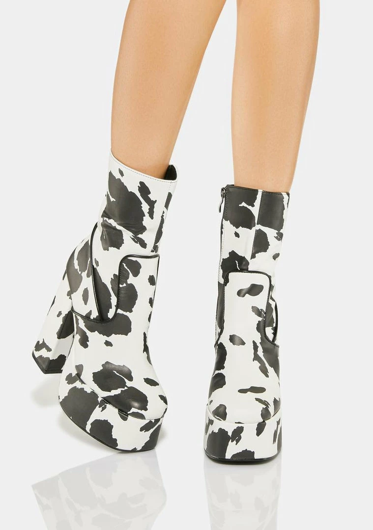 cuz you’re a barnyard belle! These chunky heeled platform boots have a vegan leather construction, side zip closures, and a cow print all over.