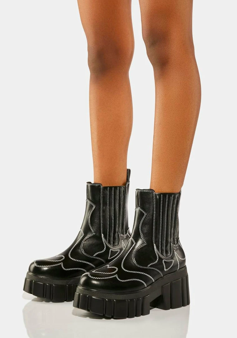 you were born to stand out! These Chelsea ankle boots have a vegan leather construction, contrast white stitching, elastic side panels for a slip-on fit, and treaded platform soles.