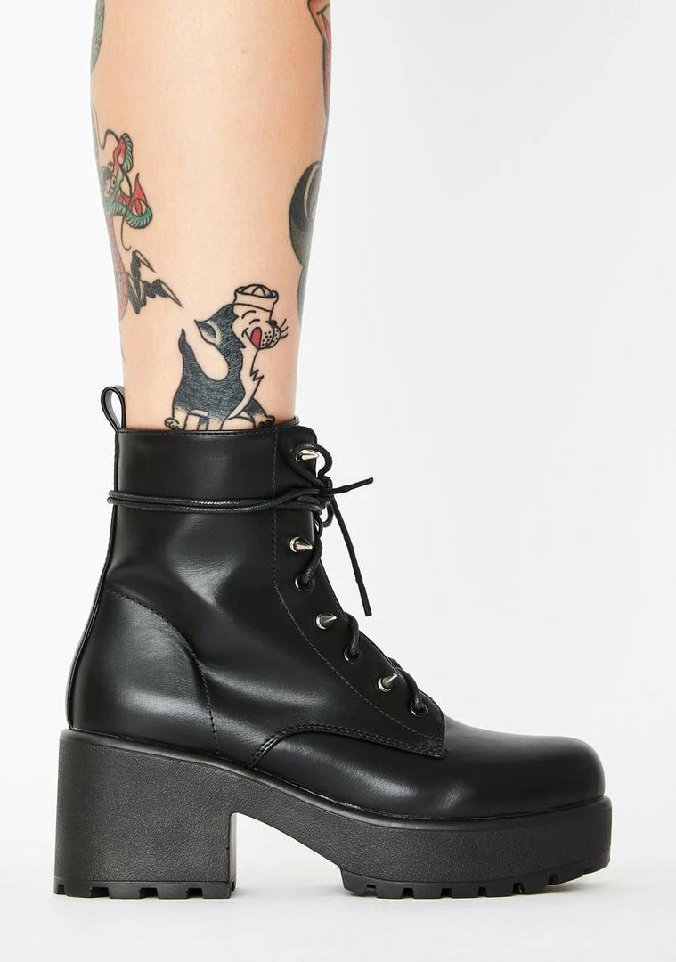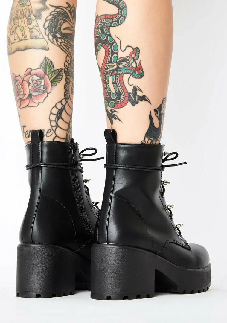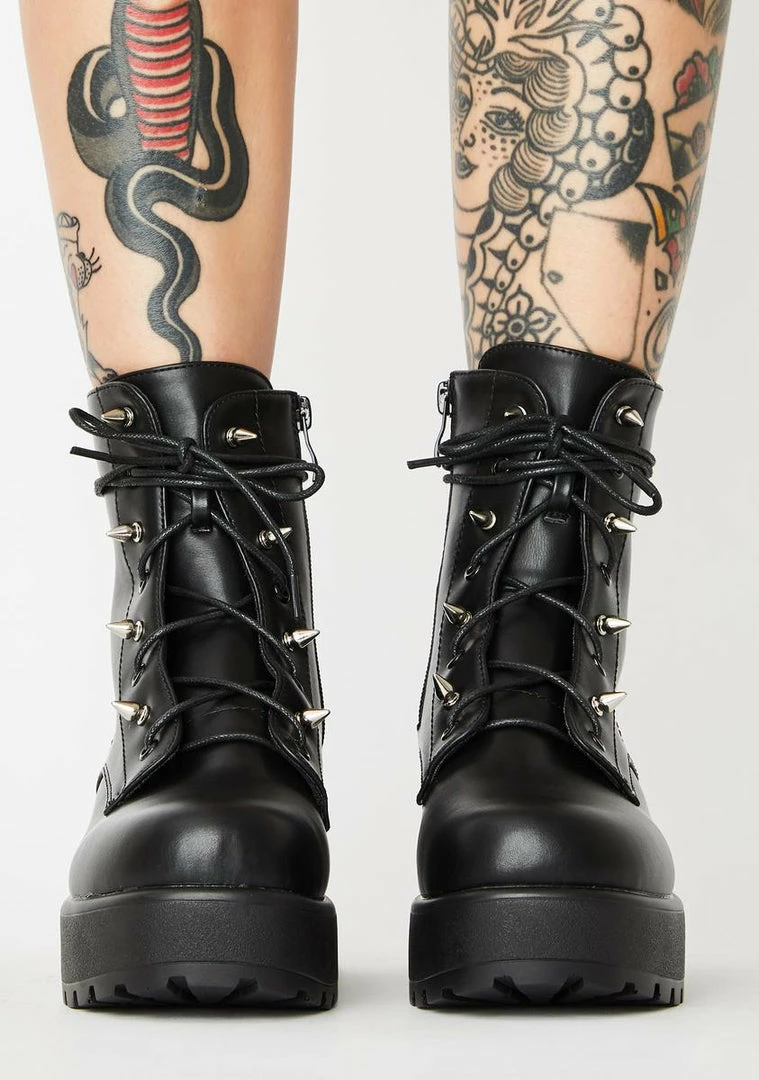 cuz yer a part of impolite society! Join the misfit brigade with these ankle booties that have lace-up fronts with spiked stud embellishments, block heels, lil treaded platforms, and inner zip closures.