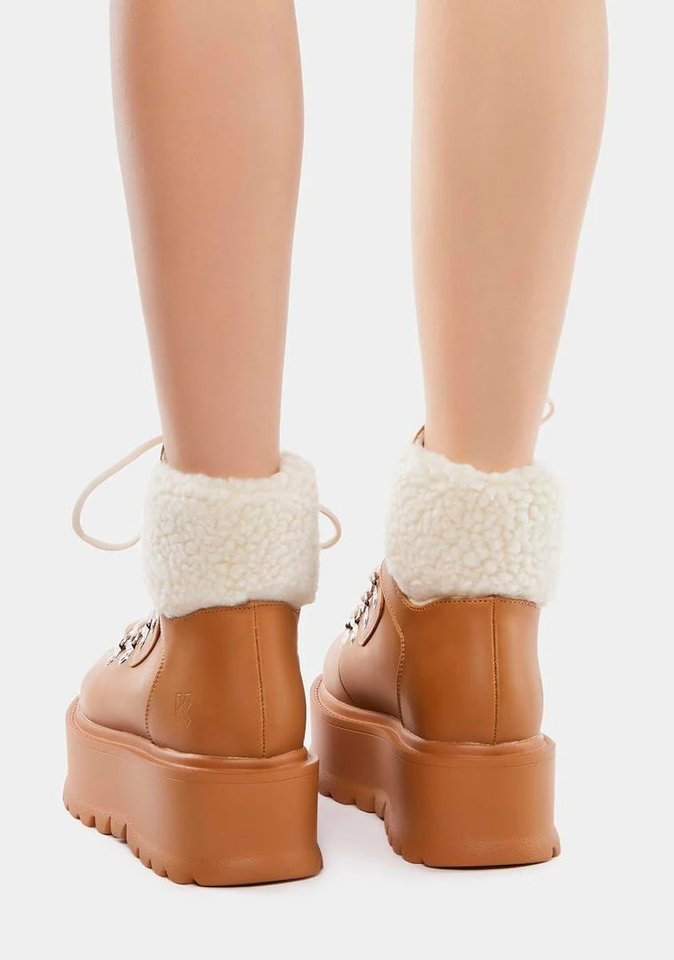 stomp it out, babe! These hiker style platform boots have a vegan leather construction, sherpa fleece trim, and adjustable D-ring lace-up closures.