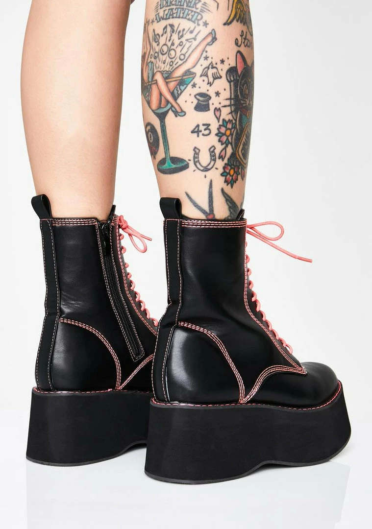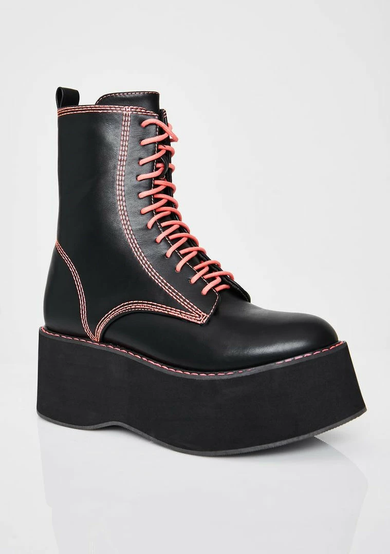 cuz youΓ’ΒΒre mysterious, babygirl. They wait for your next move in these slick vegan leather combat boots that have thicc platform soles, contrast neon stitching, adjustable lace-ups NΓ’ΒΒ side zip closures.