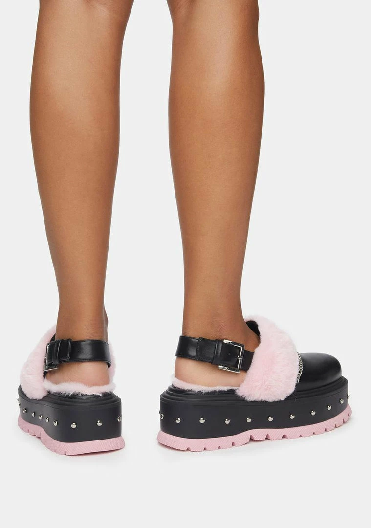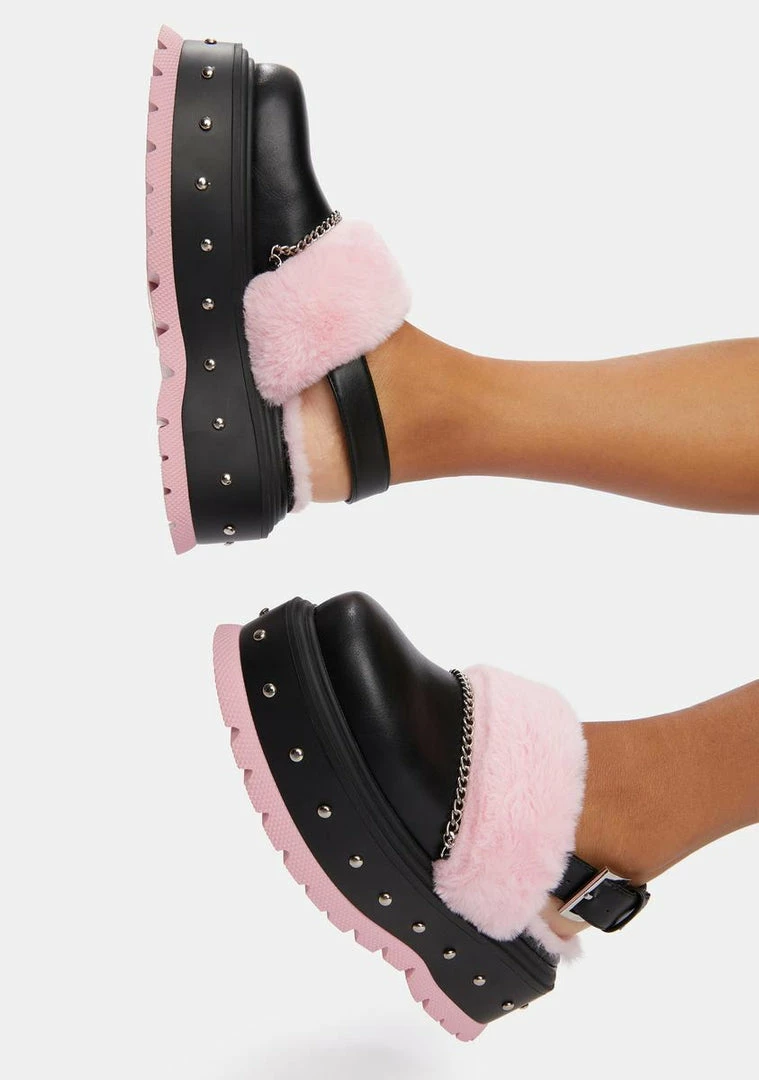 have a studded vegan leather construction, adjustable buckle strap closures, chain detailing, faux fur trims and linings, and chunky stacked platform soles.