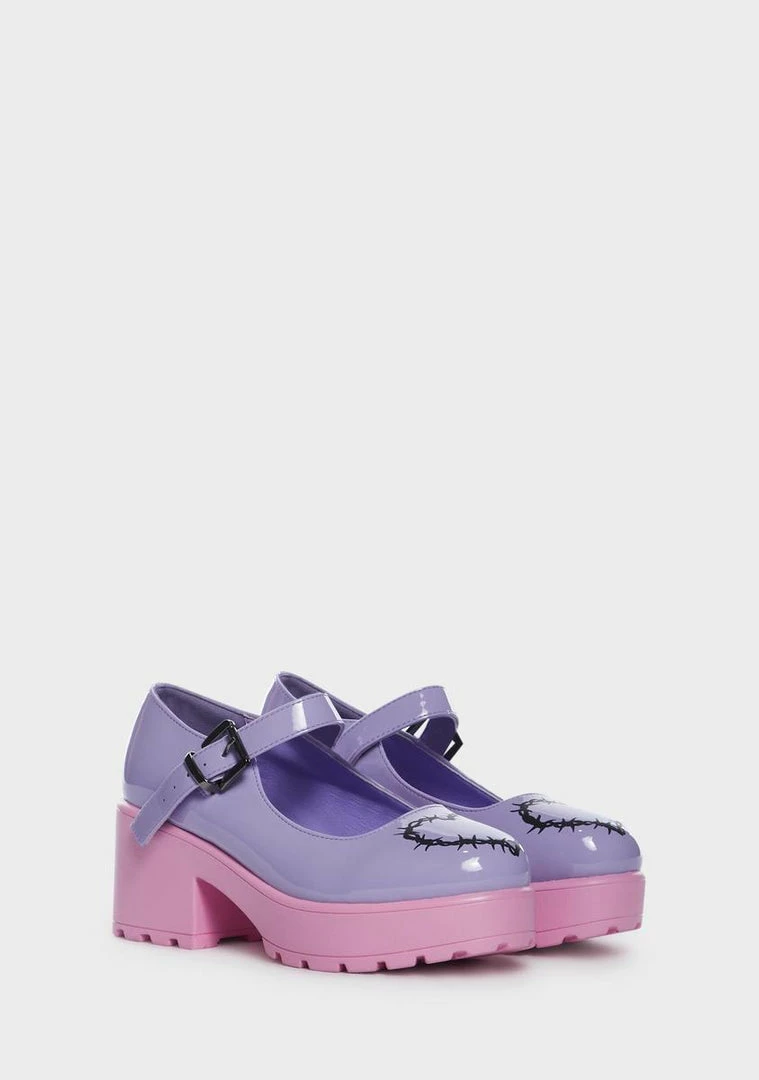 cuz love is a dangerous name. These Mary Janes have a patent vegan leather construction, barbed heart graphics, adjustable buckled vamp straps, chunky platforms, and block heels.