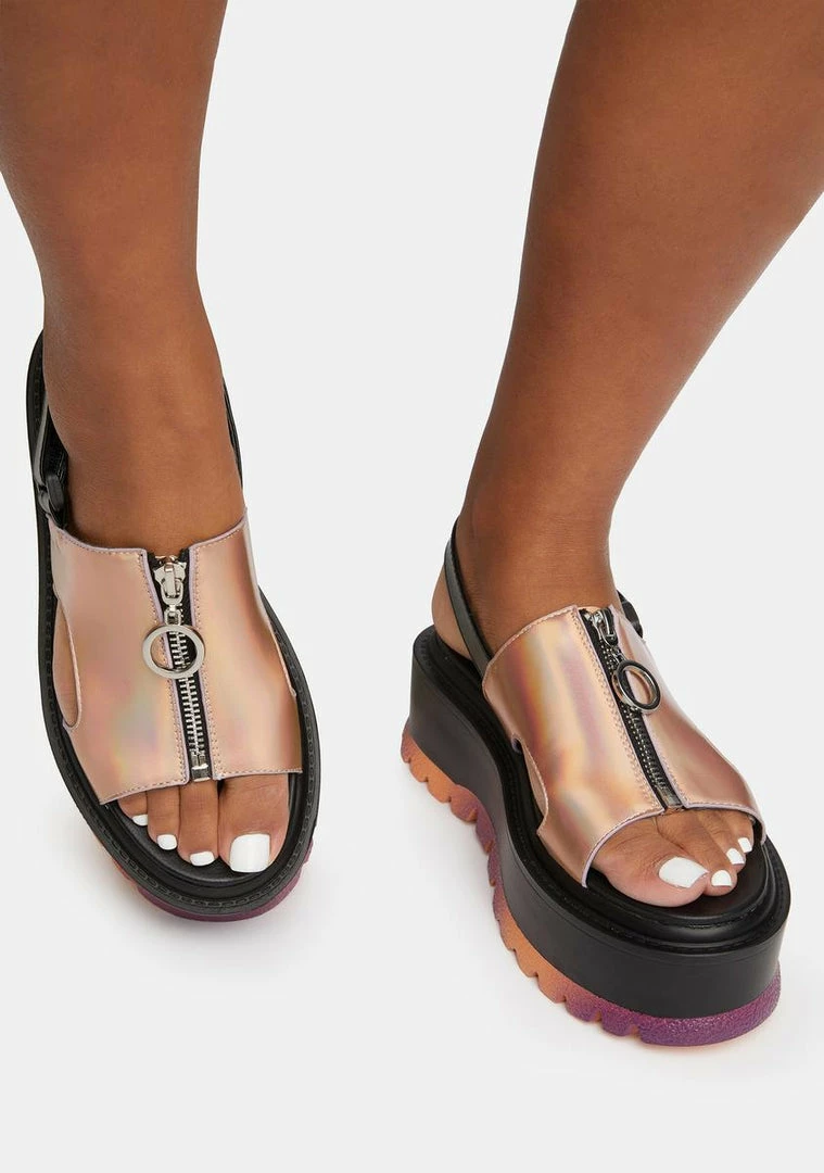 have a vegan leather construction with iridescent upper straps, front zip closures, an open toe design, and ombre rubber treaded platform soles.