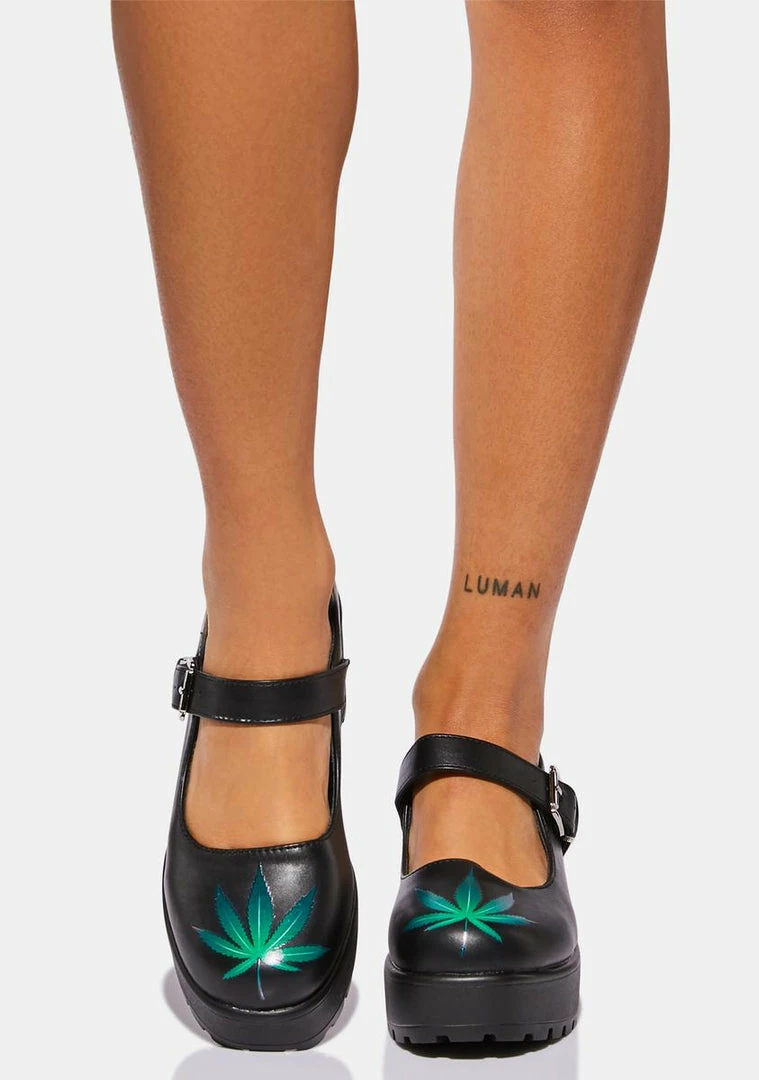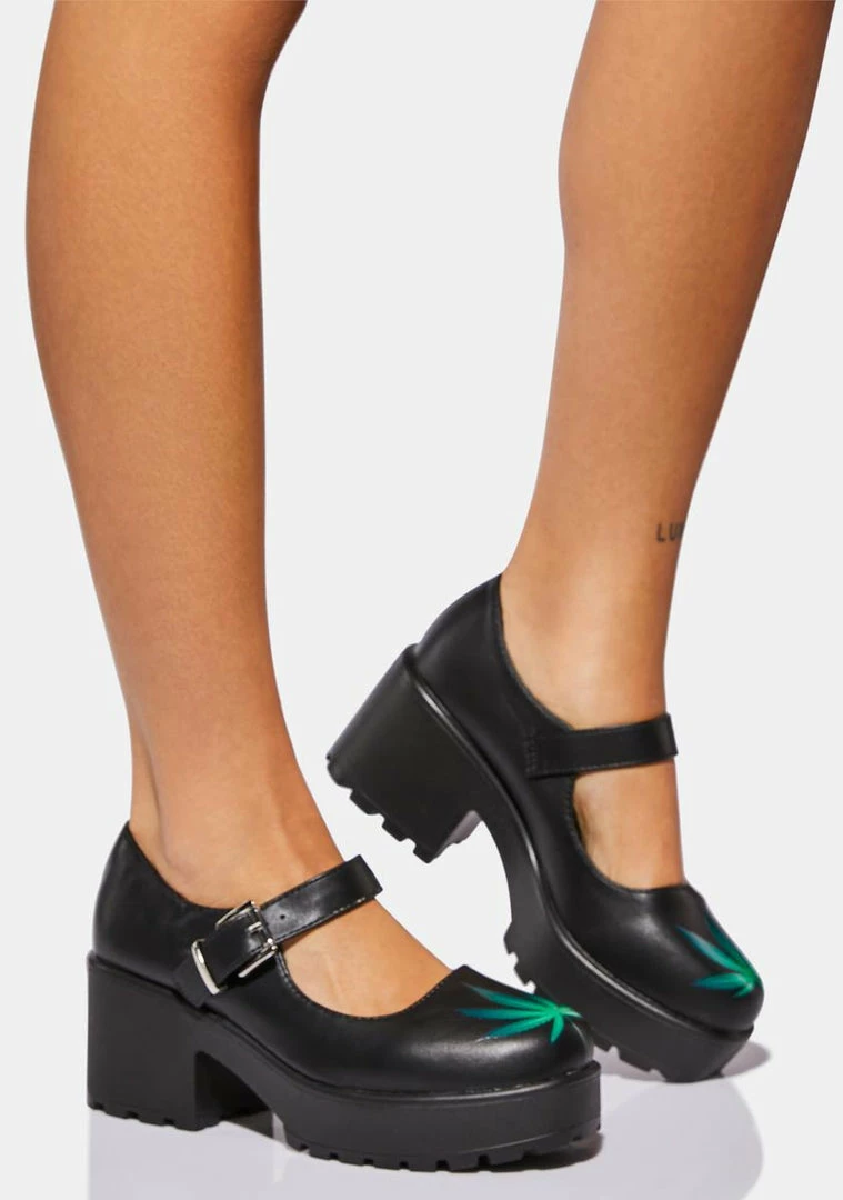 have a vegan leather construction, chunky heels, a weed leaf graphic, and adjustable buckle strap closures