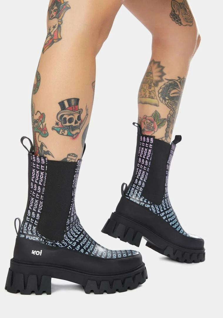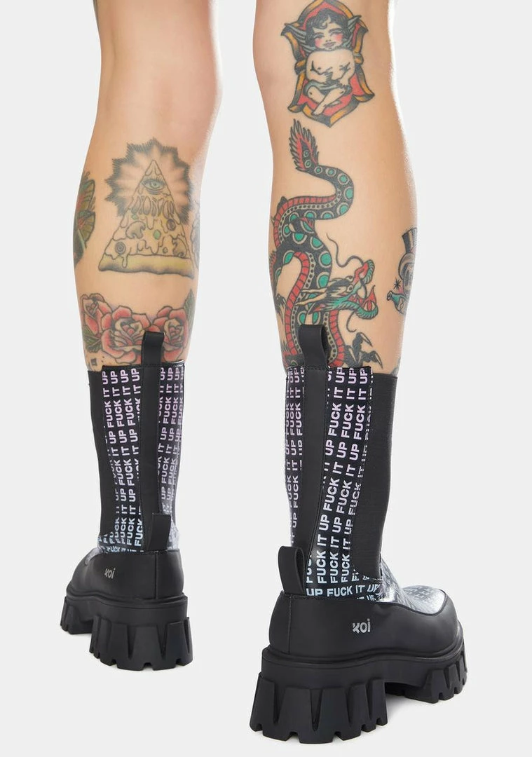 do it your way, babe! These sikk slip on chelsea boots have chunky treaded soles, high shafts with elatic panels, and vegan leather uppers with a รขยยFuck It Upรขยย print all over.