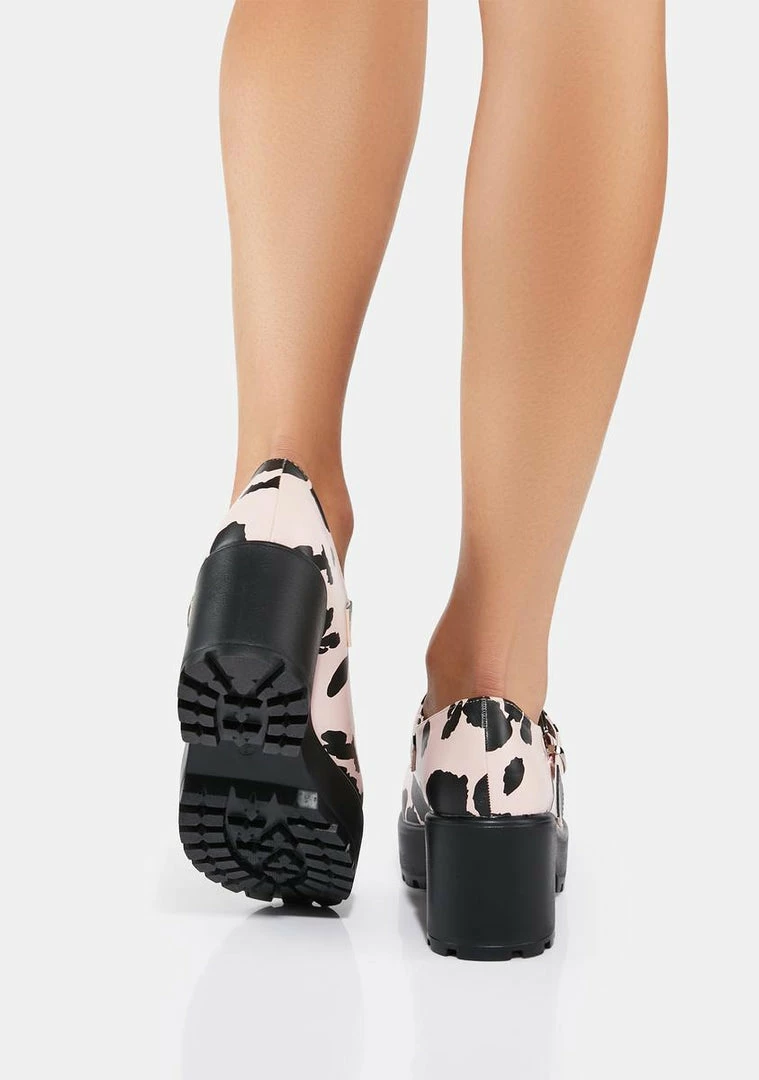 cuz youΓ’ΒΒre a classic beauty. These platform mary janes have chunky heels, an all over cow print, and adjustable buckle strap closures.
