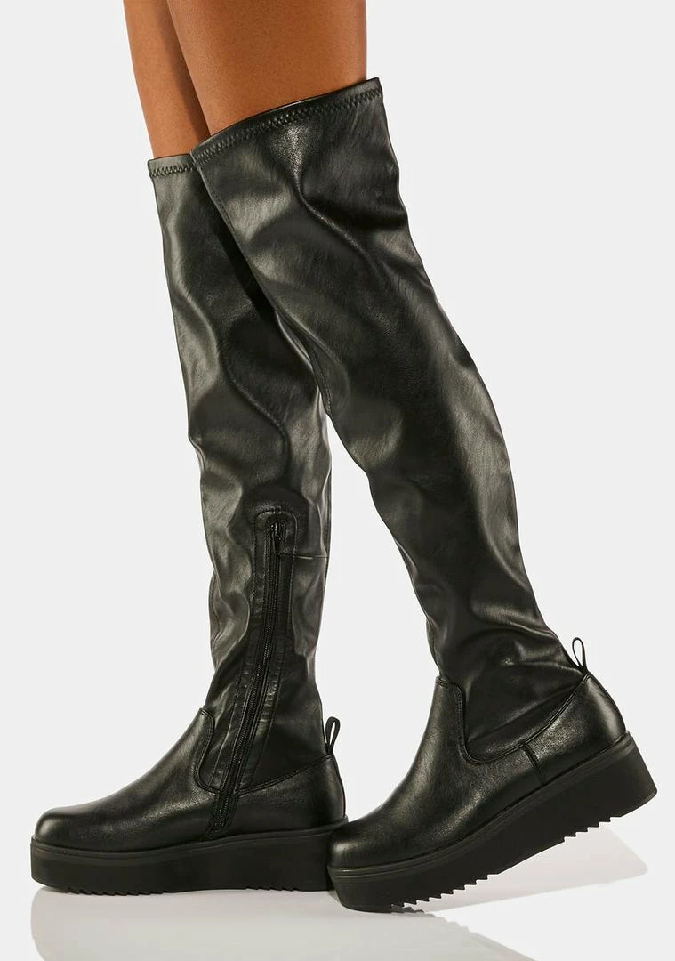 cuz you stand above the rest. These knee high boots have a vegan leather construction, side zipper closures, rounded toes, and platform soles.