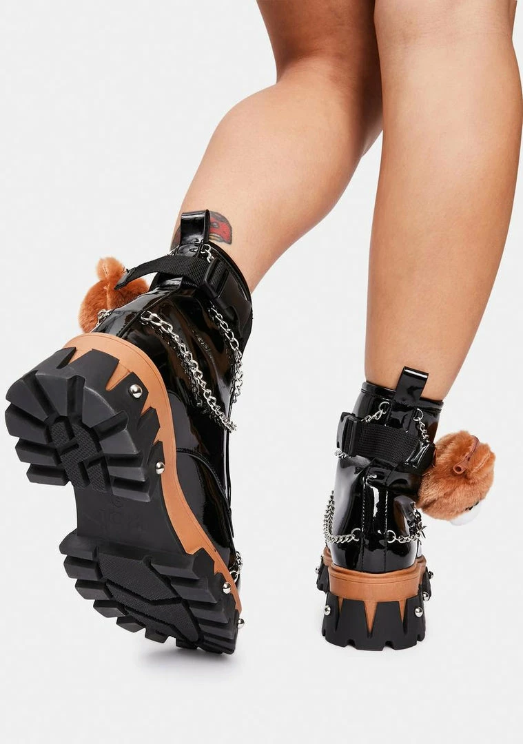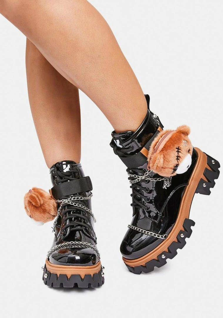 cuz you are ready for sweet dreams. These biker boots have a chunky treaded platform, chain detailing, teddy bear heard and buckle closure.