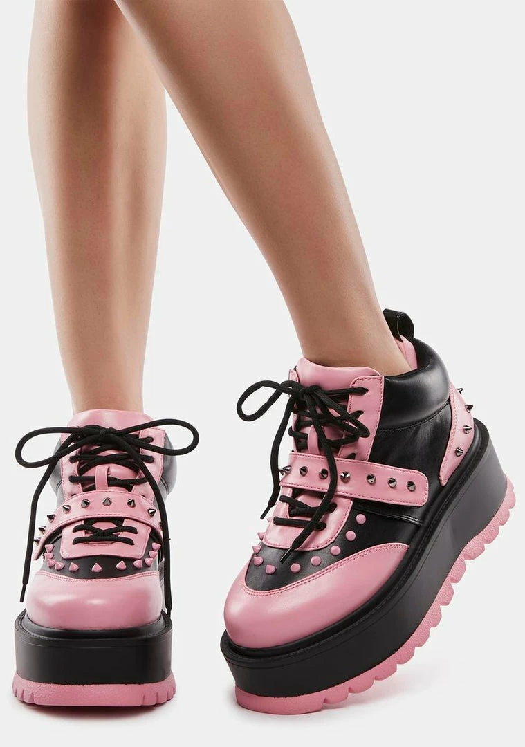 this is what kawaii heaven is made of. These sneakers come in a vegan leather construction, with a chunky platform sole, stud details, contrasting details, and lace up closures.