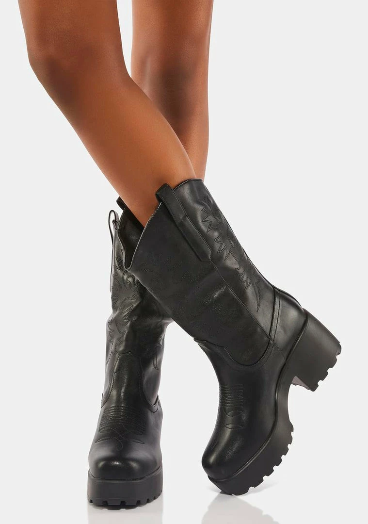 yeehaw! These cowboy boots have a vegan leather construction, embroidered details across the shafts, rounded toes, pull tabs, and chunky block heels.
