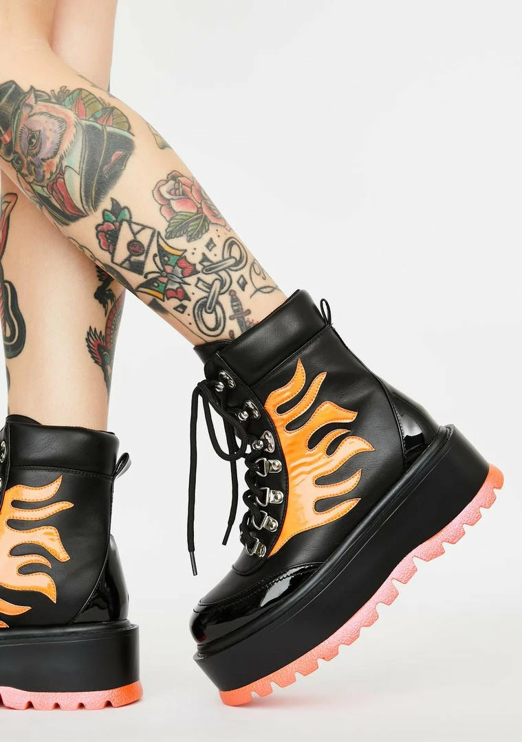 cuz you leave Γ’ΒΒem in the dust, babe! Turn up the heat in these flaminΓ’ΒΒ hott combat boots that have a vegan leather construction, chunky platform soles NΓ’ΒΒ adjustable lace-up closures.