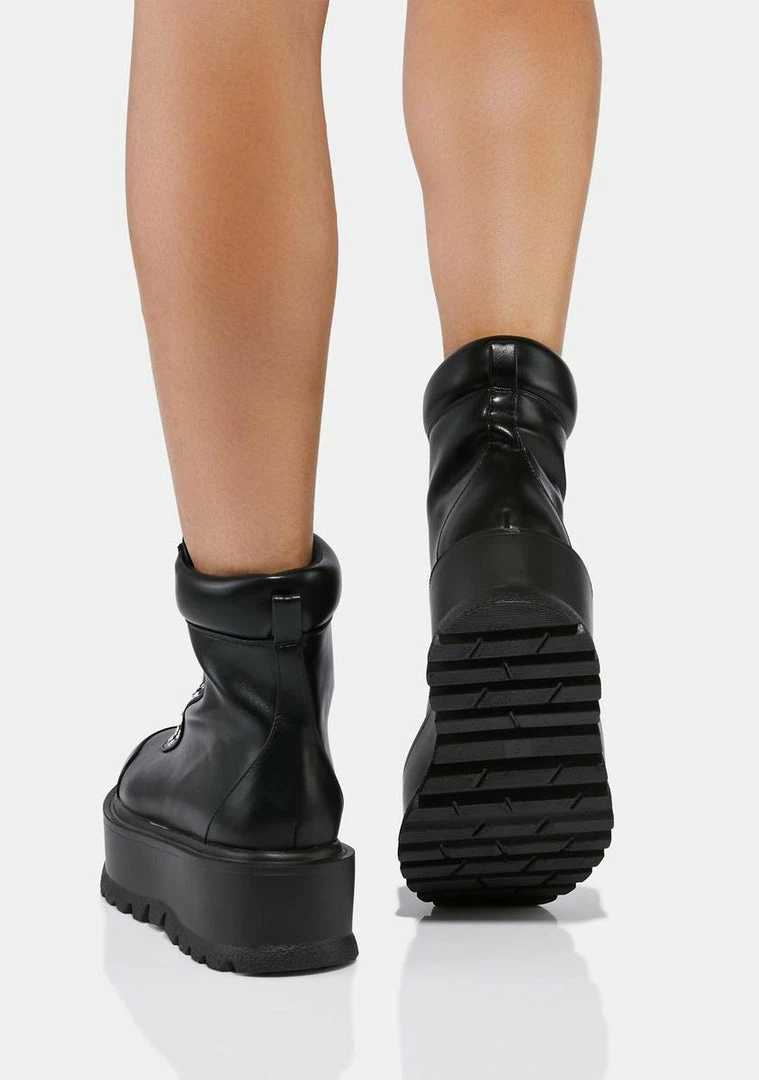 have a vegan leather construction, padded collars, front lace up closures with D-ring hardware, stitching details, and chunky platform soles.