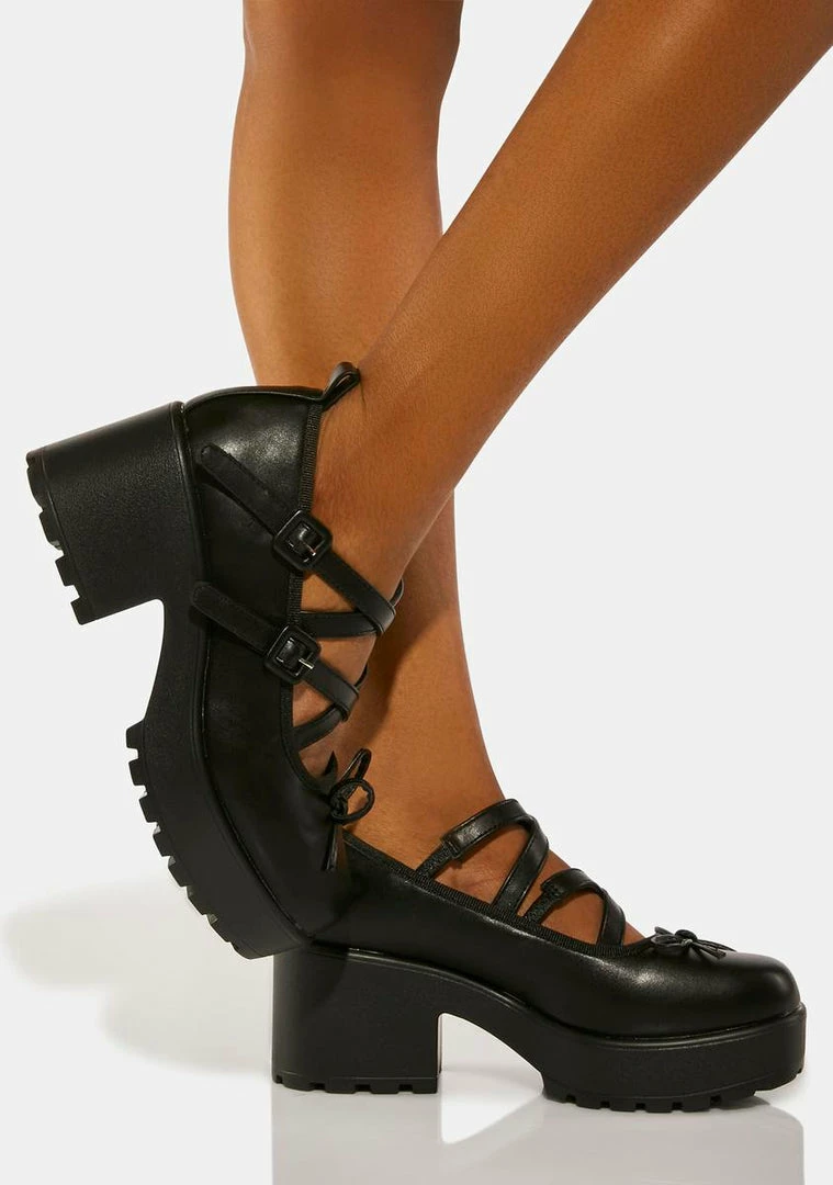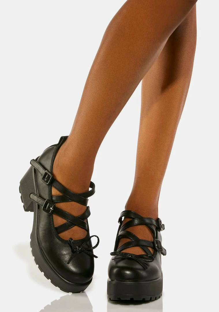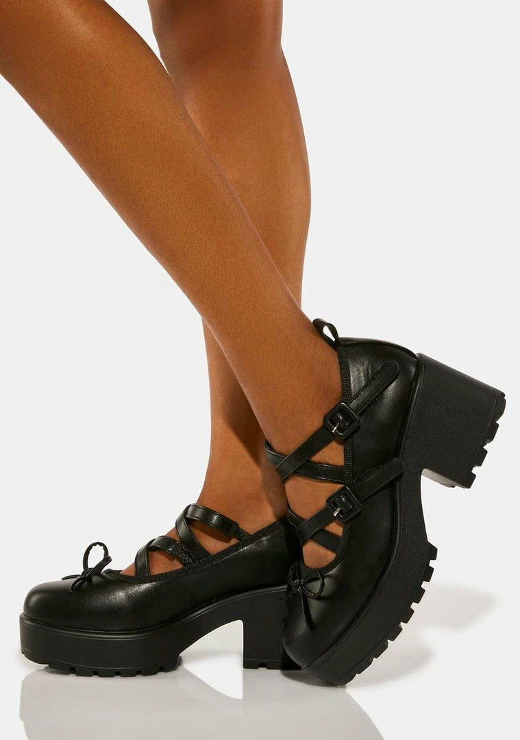 cuz you’re not all sweet. Get edgy in these ballet-inspired mary janes that feature little bows at front, adjustable crisscross straps with buckle closures, and a chunky treaded platform.