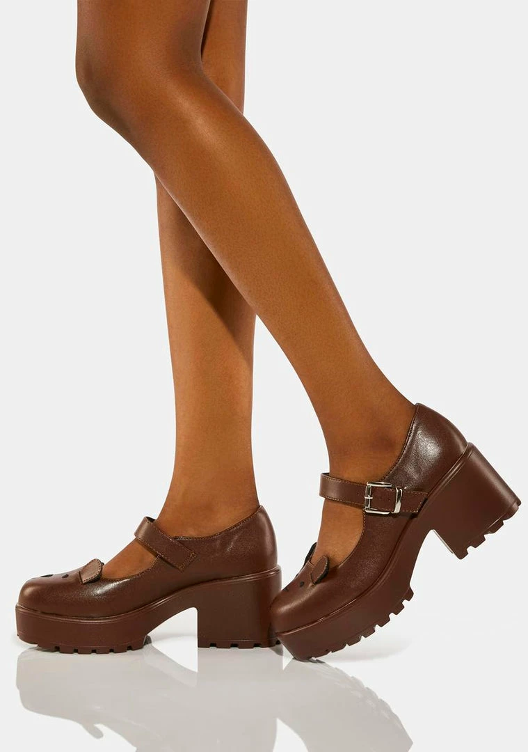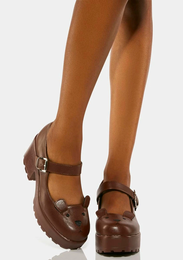 come in a vegan leather construction, with a teddy bear detail on the front, a closed toe, treaded platform heels, and an ankle strap with a buckle closure.