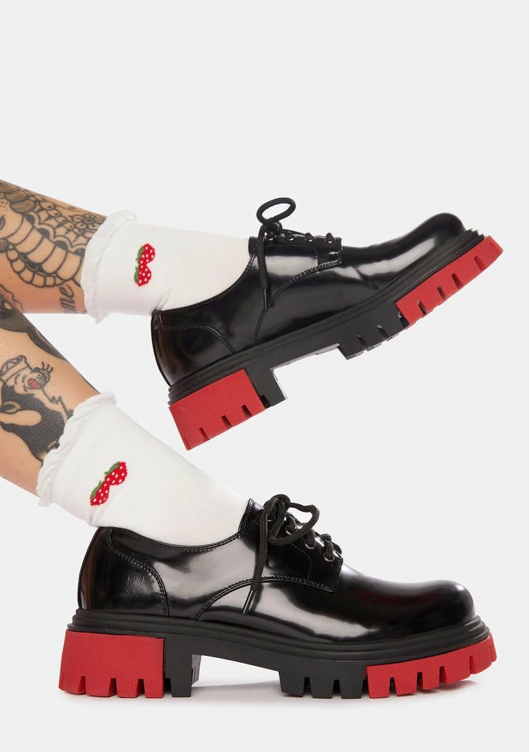 feature slick vegan leather uppers. These grungy oxfords have treaded platform soles with a contrast colorblock design and lace up fronts.