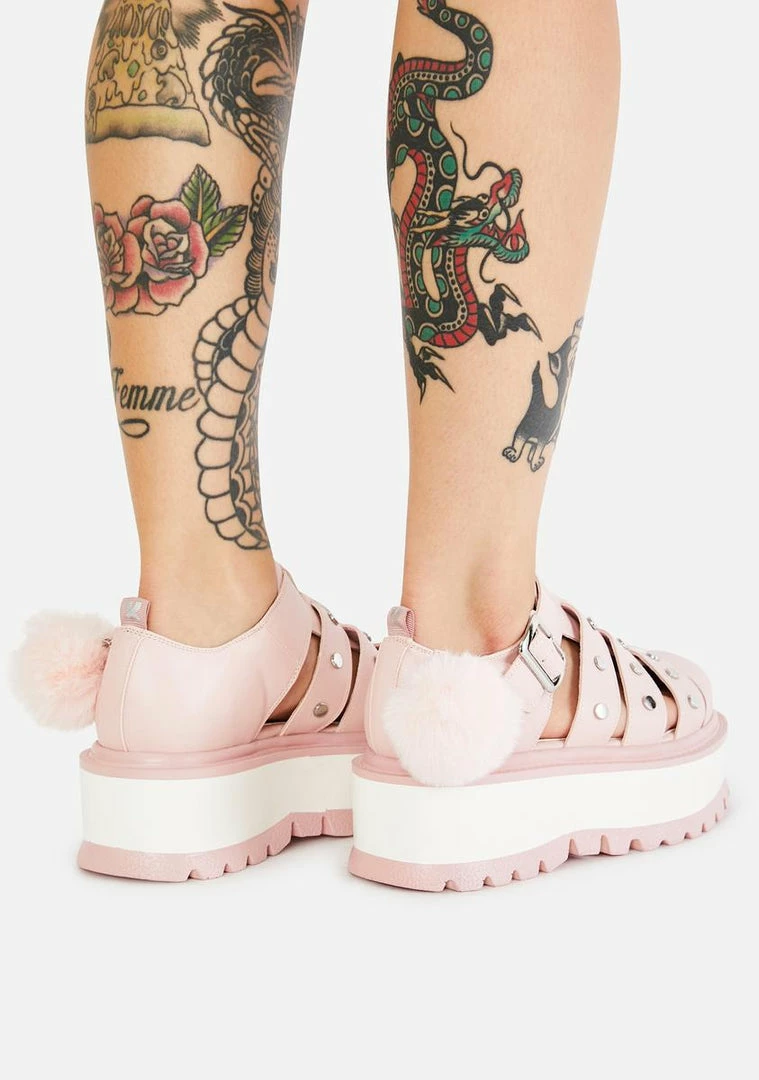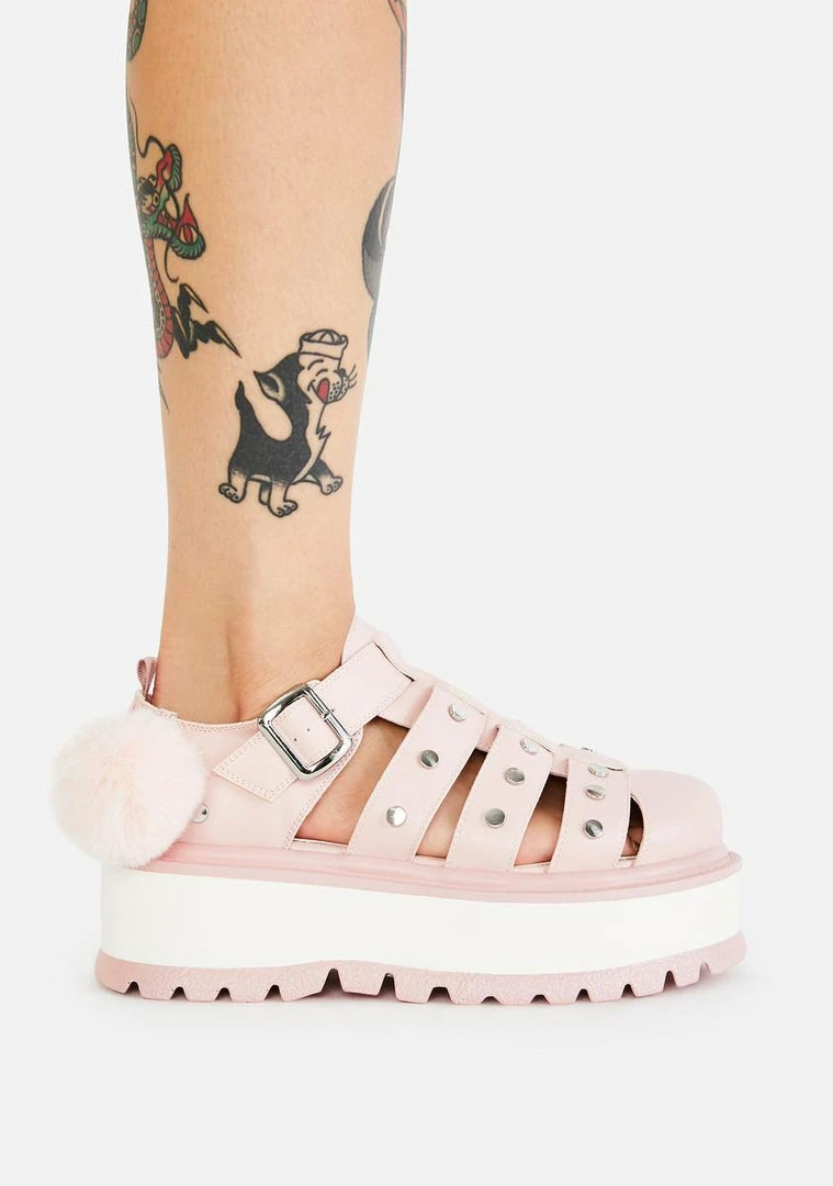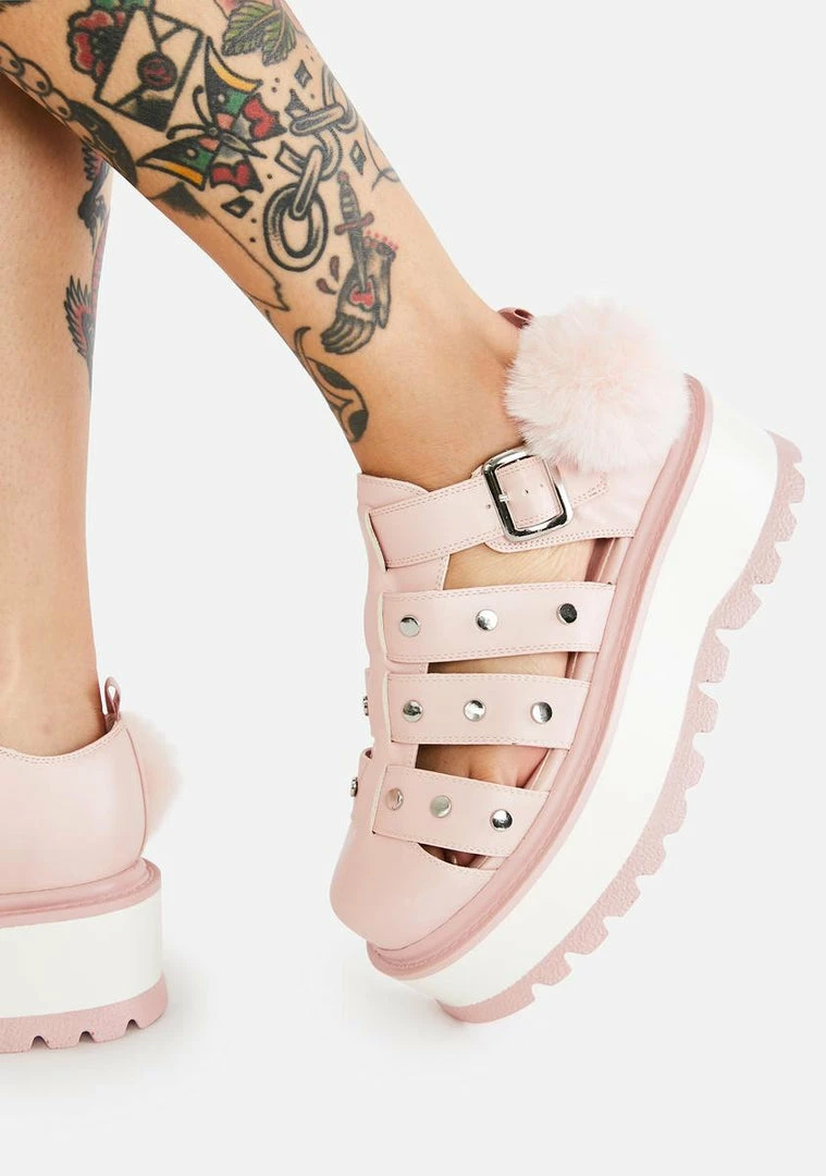 will have ya walking on cloud nine! These adorable platform sandals have vegan leather gladiator style uppers, closed toe fronts, stud detailing, lil faux fur pom poms, and ankle buckle closures.