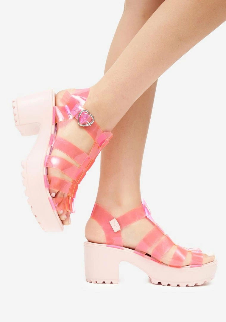 cuz youΓ’ΒΒre as cute as can be! These strappy jelly sandals have chunky block heels and adjustable heart-shaped buckle strap closures.