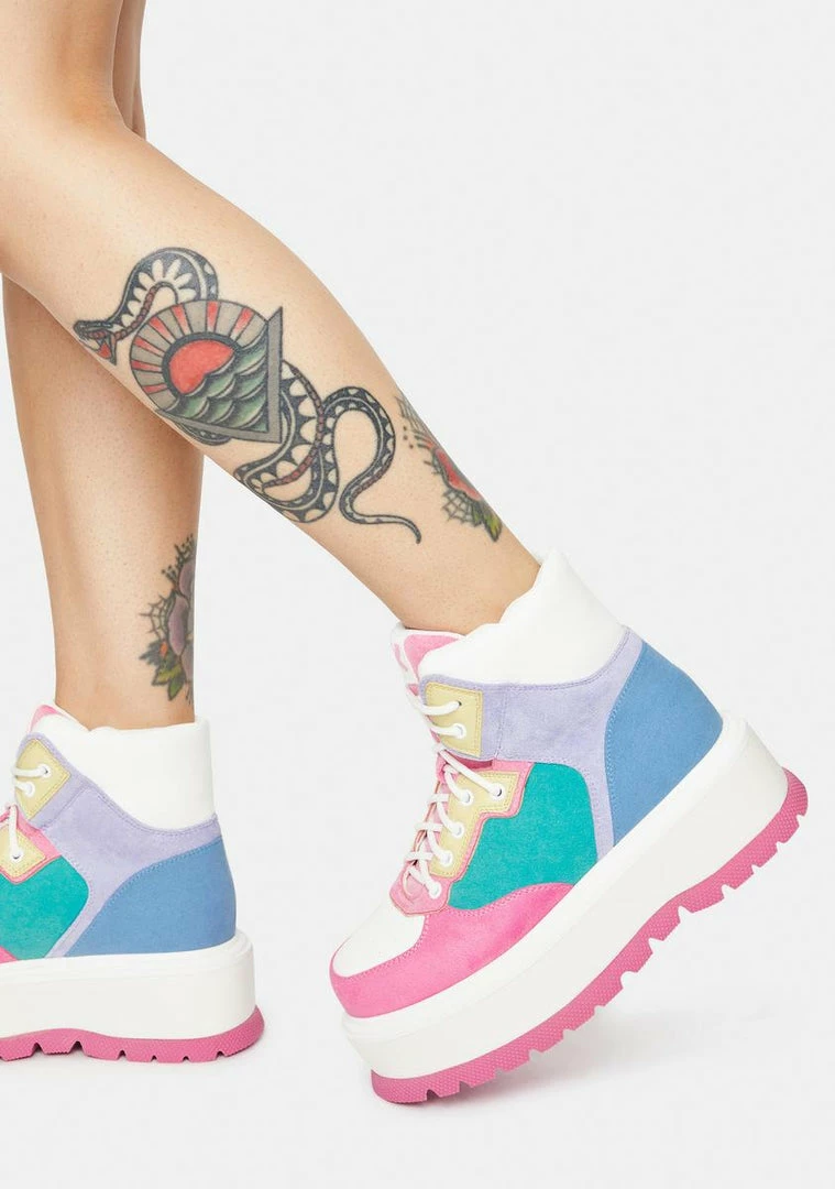 feature a color block design, faux suede uppers, front lace up closures, and platform soles.