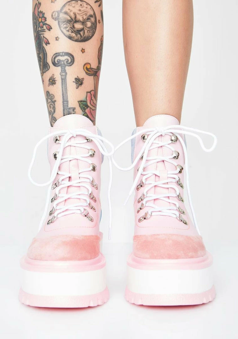 will have ya on your worst behavior. ThereΓ’ΒΒs no hesitation in these sikk combat boots that have a pastel color block design, front lace-up closures, NΓ’ΒΒ chunky platform soles.