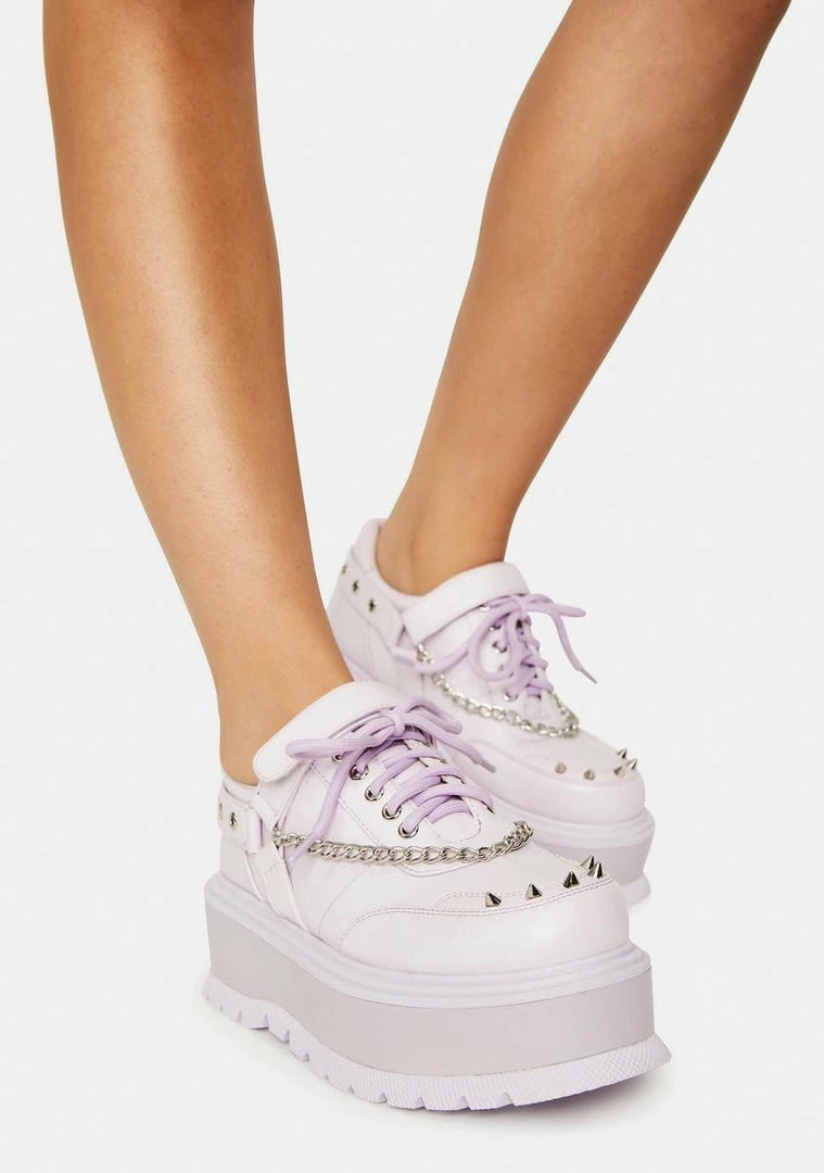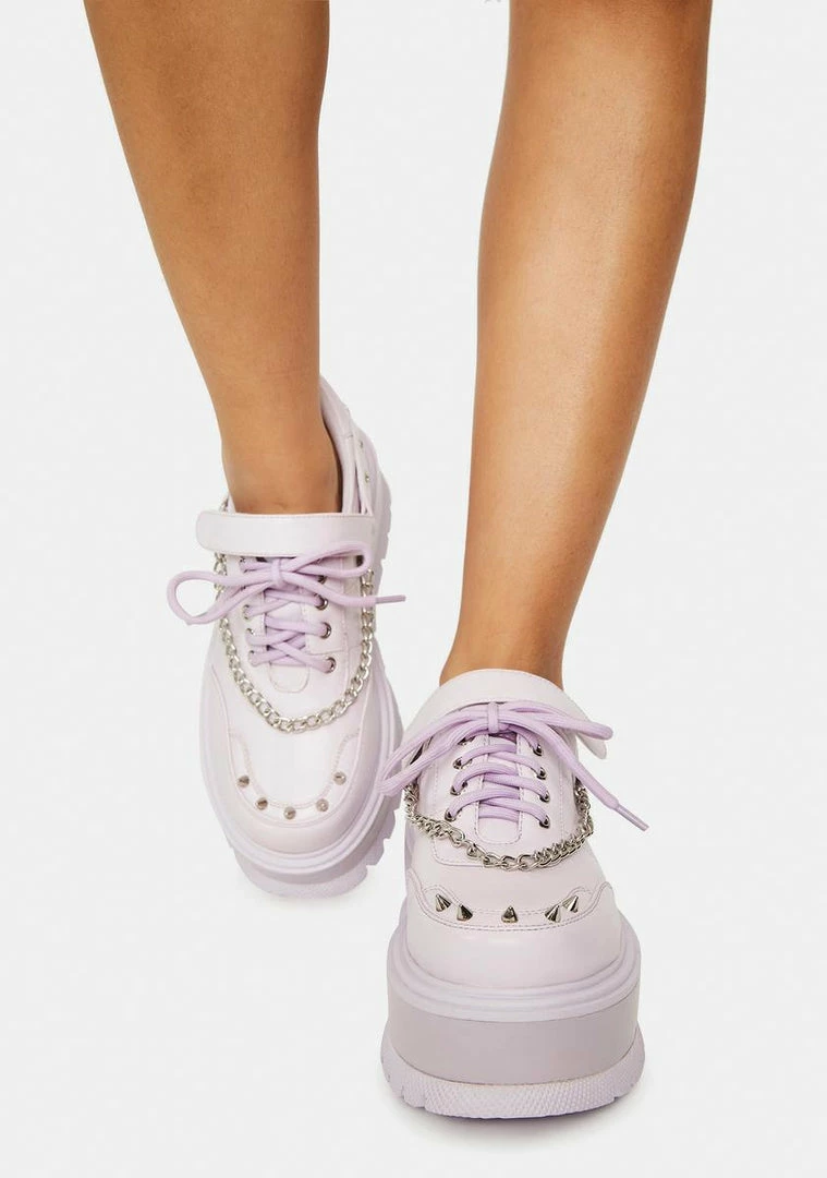 feature a low rise ankle fit, a platform treaded sole, metallic stud and chain details, and a lace up upper closure.