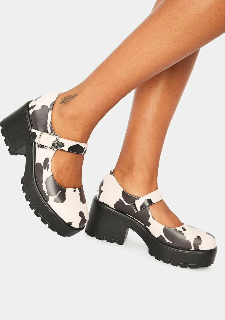 holy cow, you look amazing! These patent faux leather mary janes have a cow print upper, buckle strap closures, and treaded platform heels.