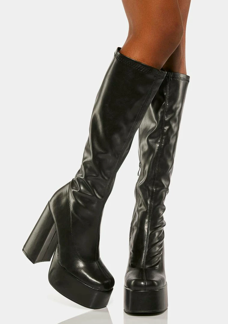 cuz there’s no sleep for the wicked. These platform boots feature a knee-high construction, zipper closures at sides, and are made from vegan leather.