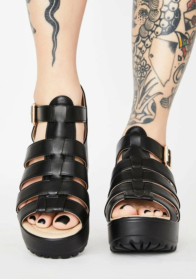 gotcha feelinΓ’ΒΒ like #1, bb! Stomp out the competition in these gladiator style sandals that have a vegan leather construction, treaded platforms, block heels, and ankle buckle closures.