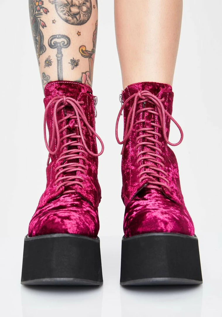 will have ’em crushin’ hard on ya! Keep it sassy in these velvet combat boots that have thicc platform soles, adjustable lace-ups N’ side zip closures.