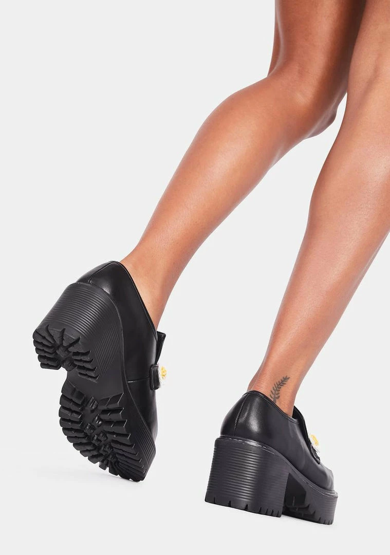 got you frolicking around, babe! These chunky loafers have platform soles and little flower details on top.