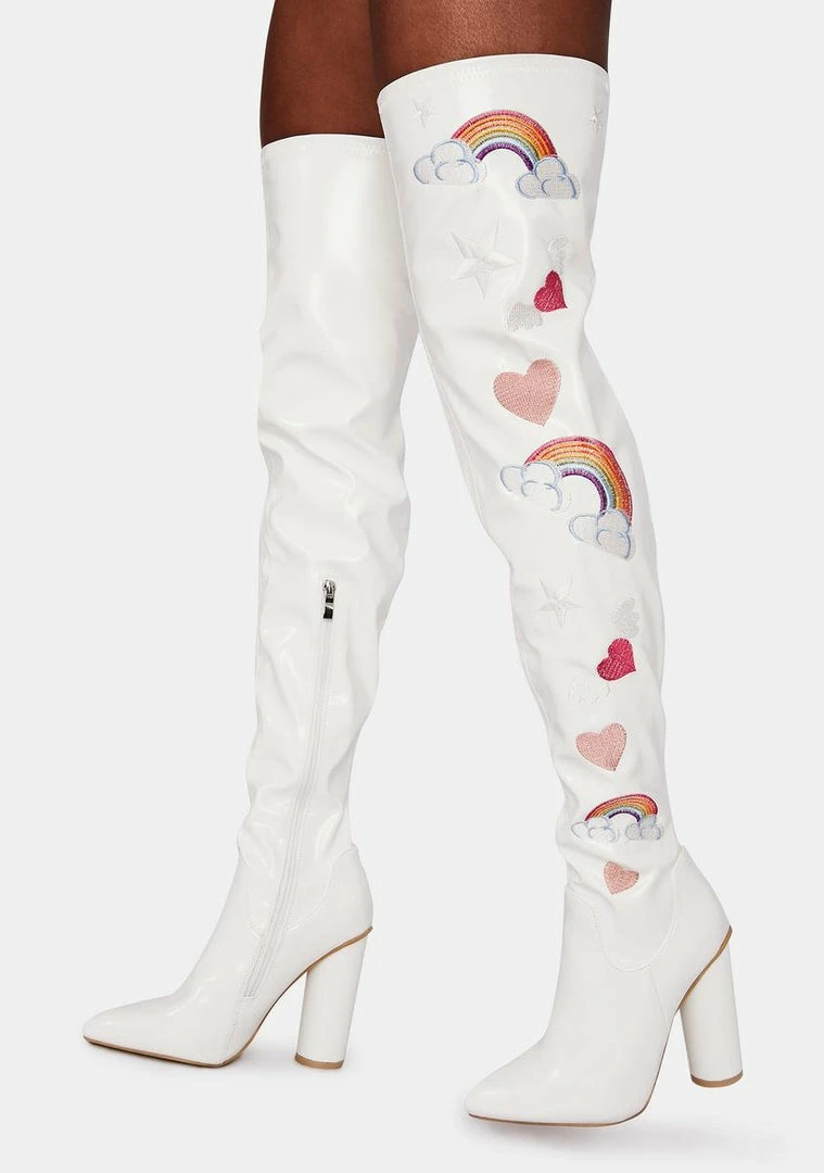 cuz youΓ’ΒΒre sugar, spice, and everything nice! These thigh high boots have a shiny vegan leather construction, rainbow and heart graphics, and side zip closures.