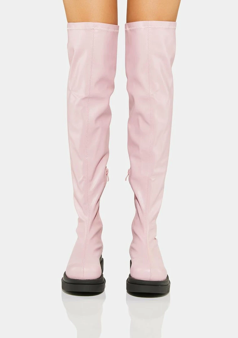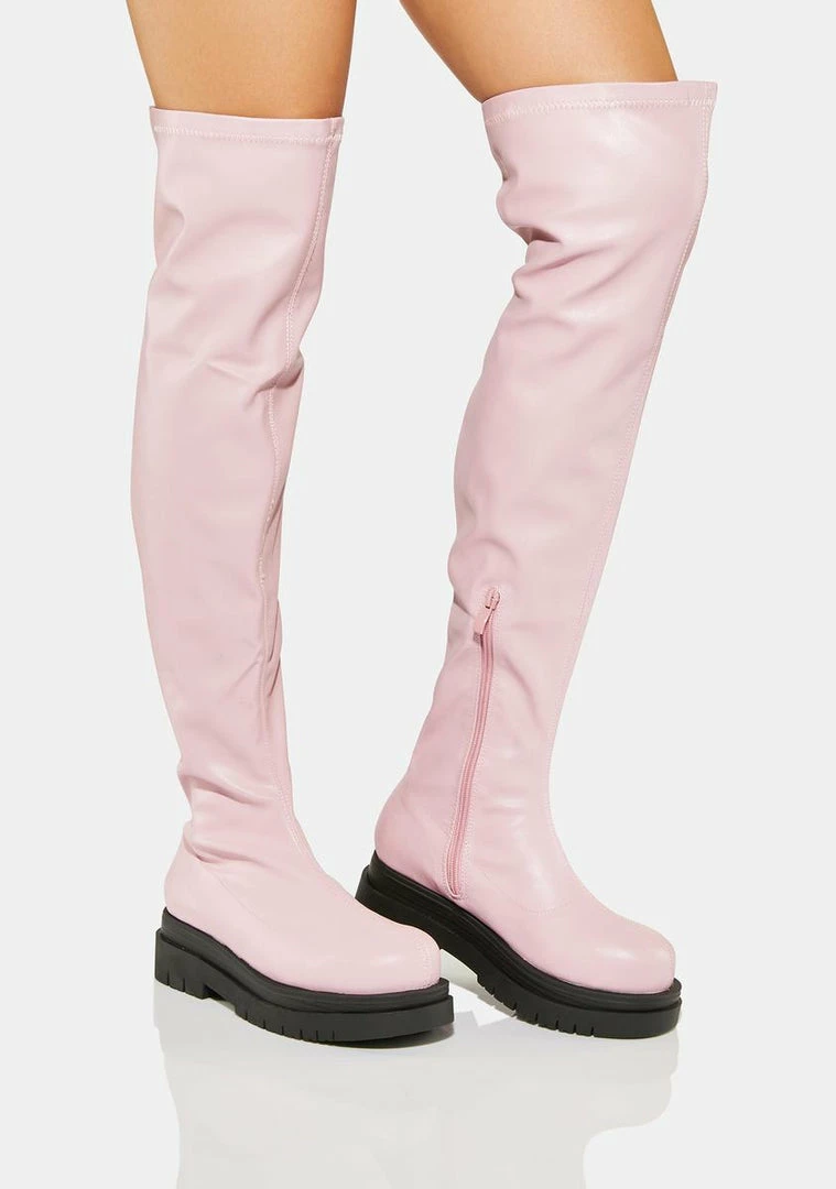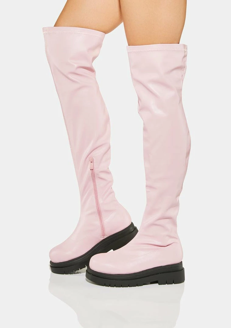 cuz you can be sour, but you’re also really sweet! These knee high boots have a vegan leather construction, side zip closures, and contrast colored soles.