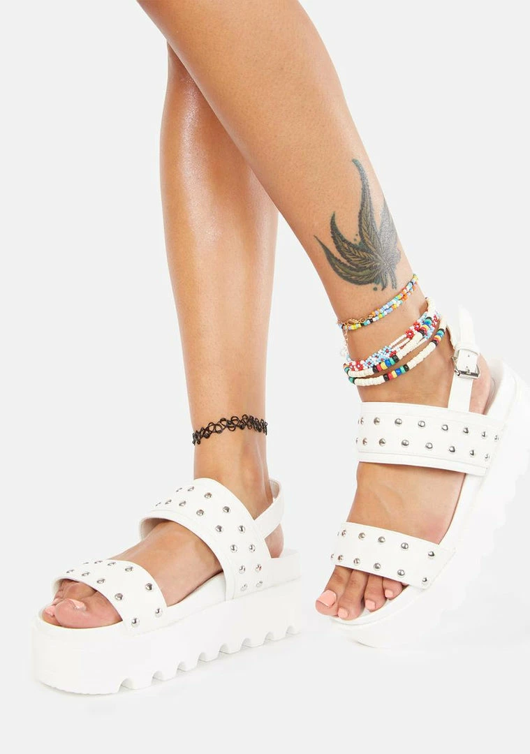 because youΓ’ΒΒre ready for fun! These 90Γ’ΒΒs style chunky platform sandal have a sporty treaded sole, studded vegan leather upper design and slingback buckle closure.