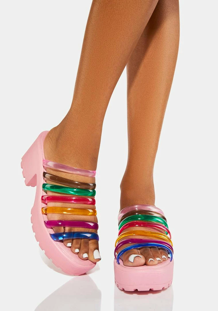 you’re sweet like candy! These sandals have strappy rainbow uppers, peep toes, platform soles, and block heels.