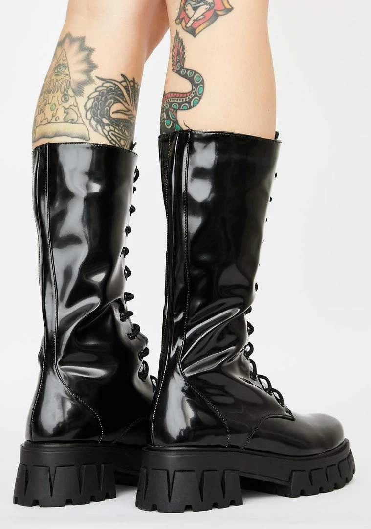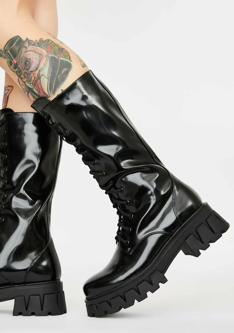 cuz youâre takinâ names, babe. Let âem know youâre not one to be messed with in these patent vegan leather combat boots that have adjustable lace-up closures and chunky AF platform soles.